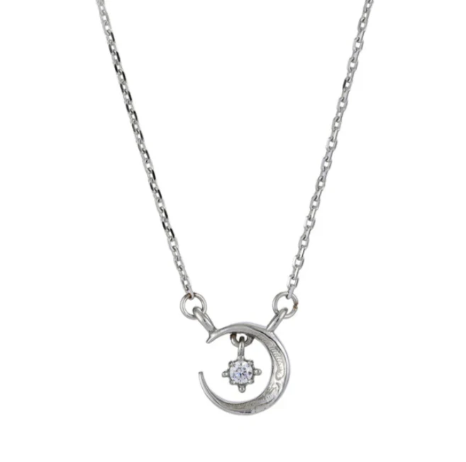 Dámský náhrdelník z chirurgické oceli s kamínkem. Náhrdelník s ozdobou srpku měsíce, uprostřed kterého září hvězda v podobě zirkonu. Srpek měsíce má průměr 10mm. Pohledová strana srpku je ozdobená rytinou, boky a zadní strana jsou leštěné. Řetízkové části náhrdelníku jsou leštěné, průměr řetízků 1,2mm. Délku náhrdelníku lze nastavit v rozmezí 40-45cm. Zapínání náhrdelníku je na pérový kroužek.