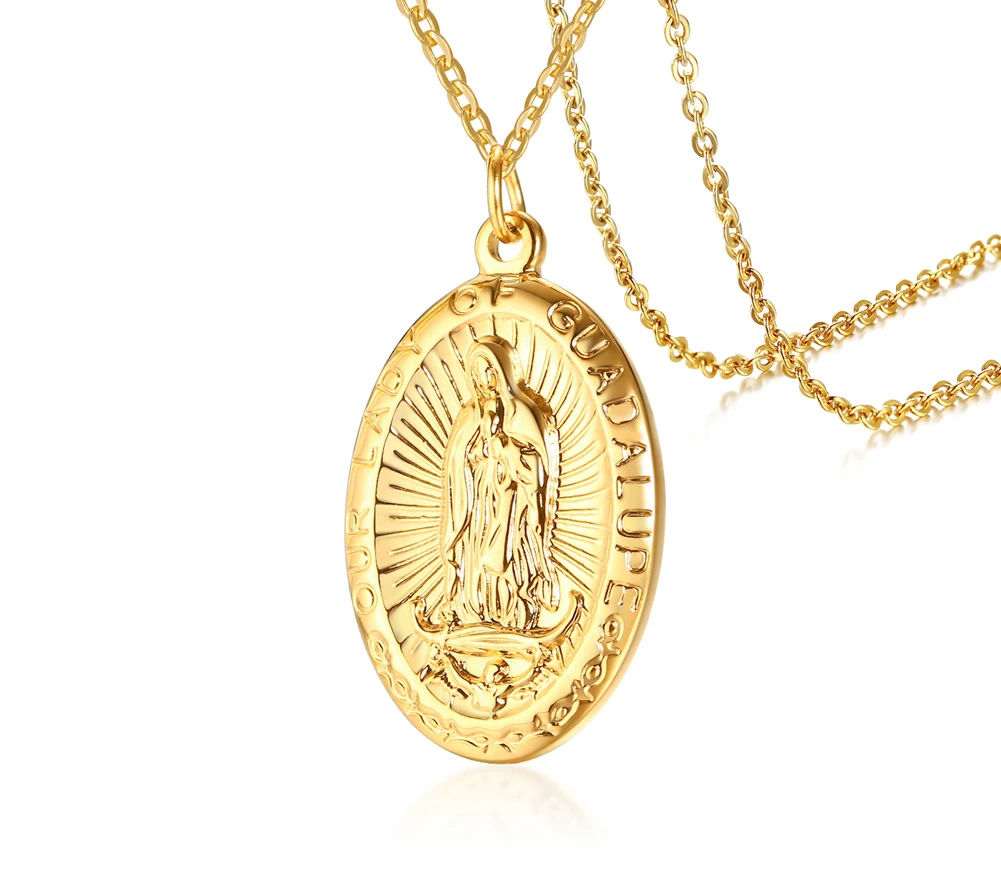 Náhrdelník z chirurgické oceli madonka. Povrch přívěsku je pozlacený technologií PVD. K madonce patří řetízek z chirurgické oceli dlouhý 50cm. Ocelový řetízek má karabinové zapínání. Rozměr přívěsku - madonky 28x45mm.