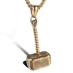 Náhrdelník z chirurgické oceli Thórovo kladivo. Ocelový řetízek se zapínáním na karabinu je dlouhý 56 cm. Velikost přívěsku 52x20mm. Náhrdelník má povrch pozlacený technologií IP.