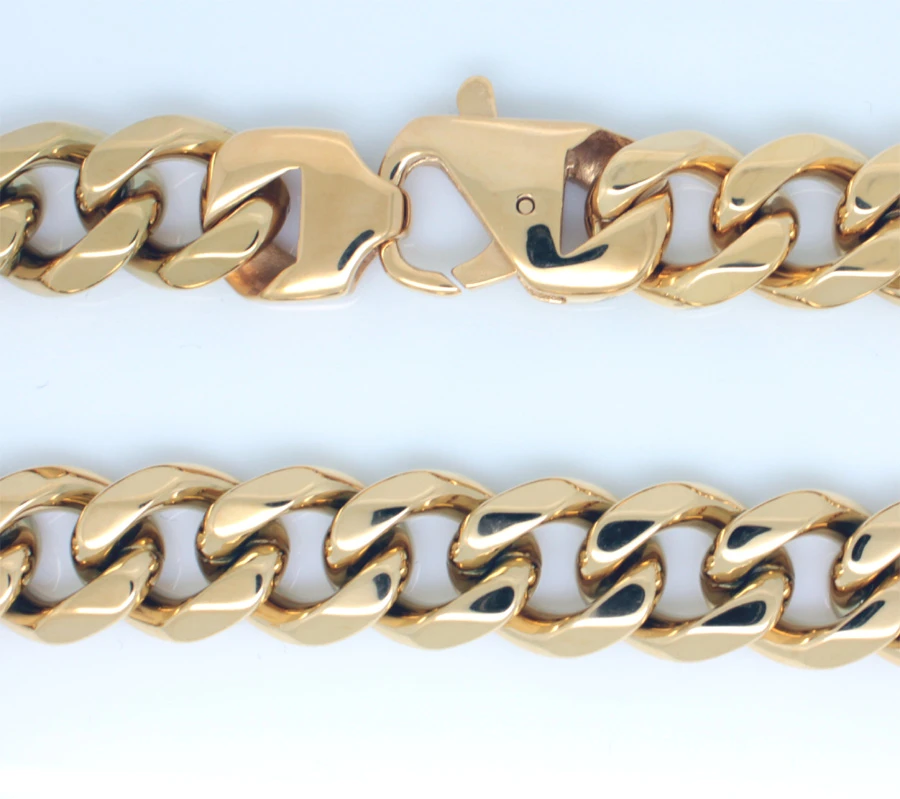 Masivní náhrdelník z chirurgické oceli na krk. Povrch náhrdelníku je leštěný pozlacený technologií PVD. Díky zaobleným hranám se náhrdelník pohodlně nosí. Karabinové zapínání zajišťuje jeho bezproblémové sundávání i nandávání. Náhrdelník je široký 15mm, tloušťka náhrdelníku 6mm.