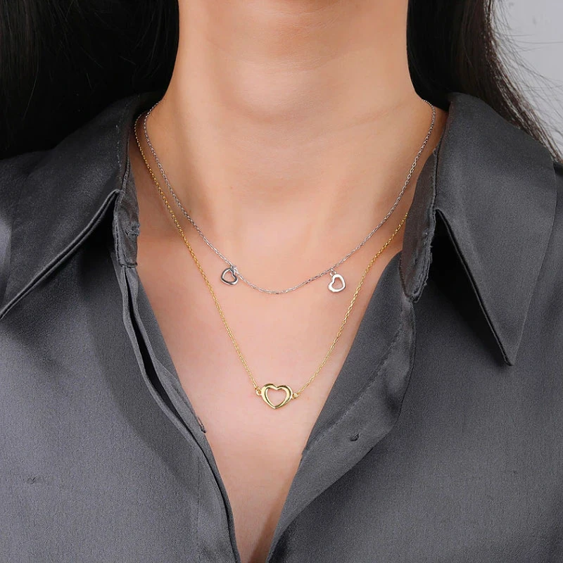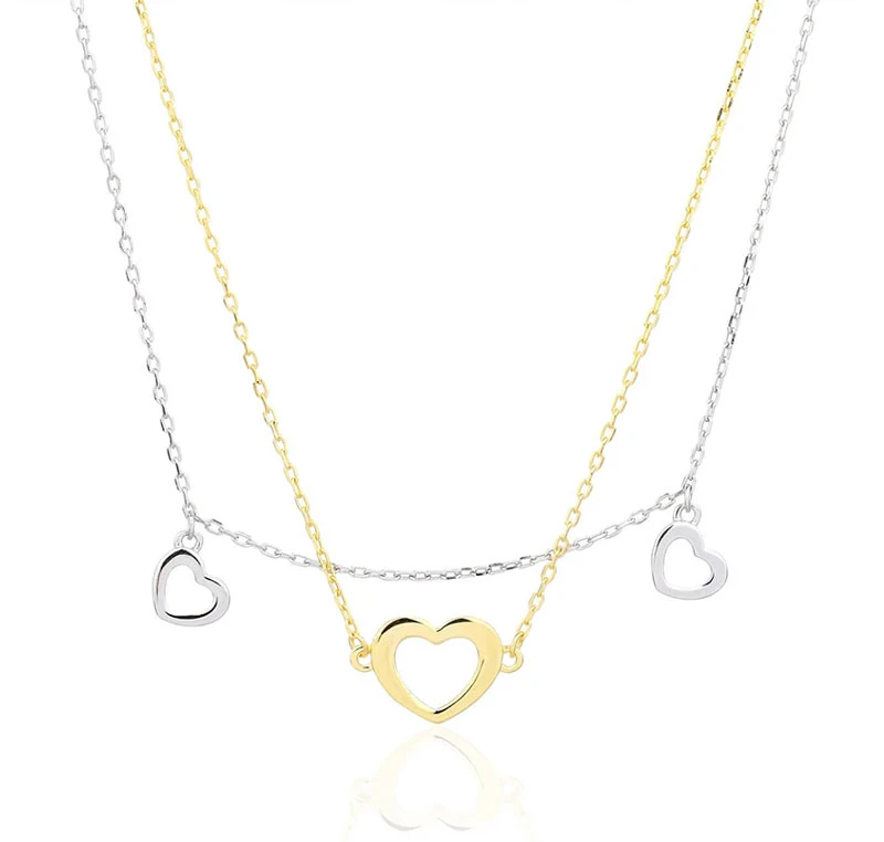 Náhrdelník se srdíčky ze stříbra 925/1000. Povrch náhrdelníku je porhodiovaný a zlacený 14K žlutým zlatem. Úprava rhodiováním dodává náhrdelníku jasnou barvu s leskem, chrání povrch šperku proti poškrábání, náhrdelník tak bude mít dlouhou dobu bezvadný vzhled. Řetízky mají průměr 1,0mm, zlaté srdíčko má rozměr 8x10mm, stříbrná srdíčka mají rozměr 7x6mm. Délku náhrdelníku lze nastavit v rozmezí 40-45cm. Zapínání náhrdelníku je na pérový kroužek.