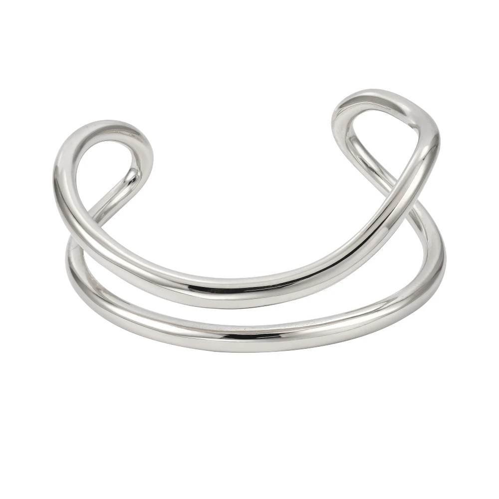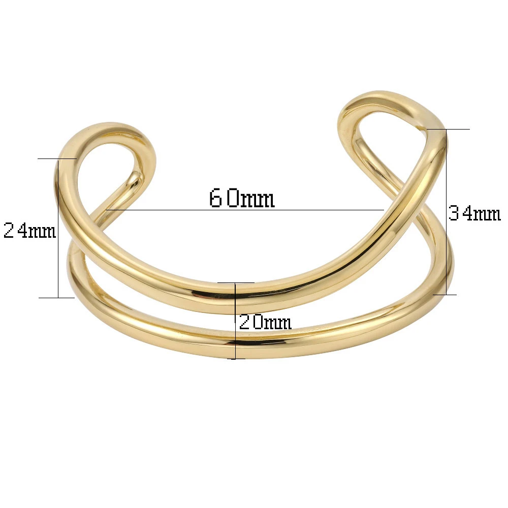 Pevný náramek z chirurgické oceli v nepravidelném tvaru. Povrch náramku je leštěný. Náramek je na jedné straně široký 24mm, na druhé 34mm, vnitřní rozměry: šířka 60mm, výška 45mm. Rozměry náramku najdete zobrazené na podpůrné fotografii.
