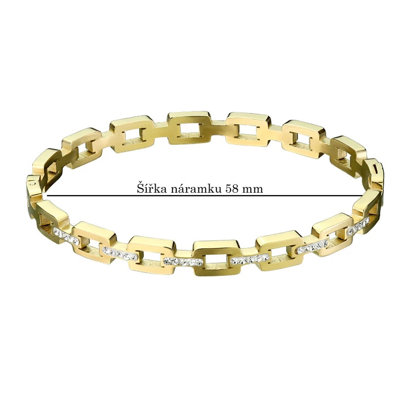 Pevný náramek z chirurgické oceli se zirkony. Náramek má leštěný povrch. Vnitřní průměr náramku 58 mm, šířka 6 mm.