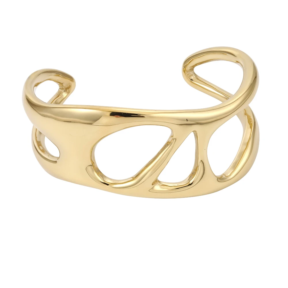 Pevný náramek bangle z chirurgické oceli nepravidelného tvaru. Povrch náramku je leštěný pozlacený technologií PVD. Ve středu je náramek široký 30mm, strany náramku jsou široké 25mm, vnitřní rozměry: šířka 60mm, výška 50mm. Rozměry náramku najdete zobrazené na podpůrné fotografii.