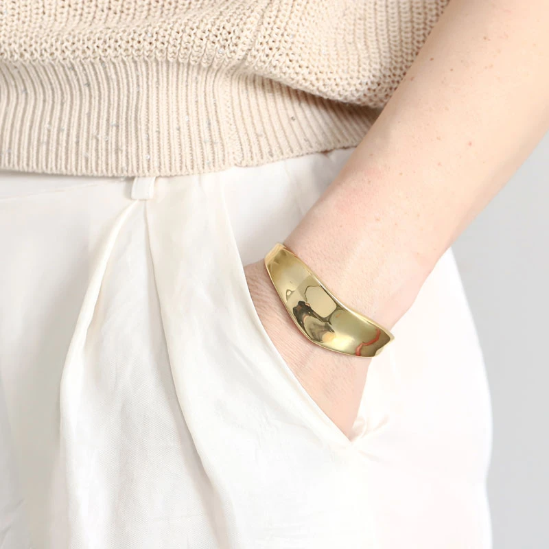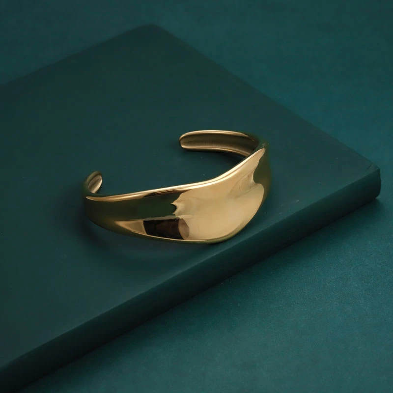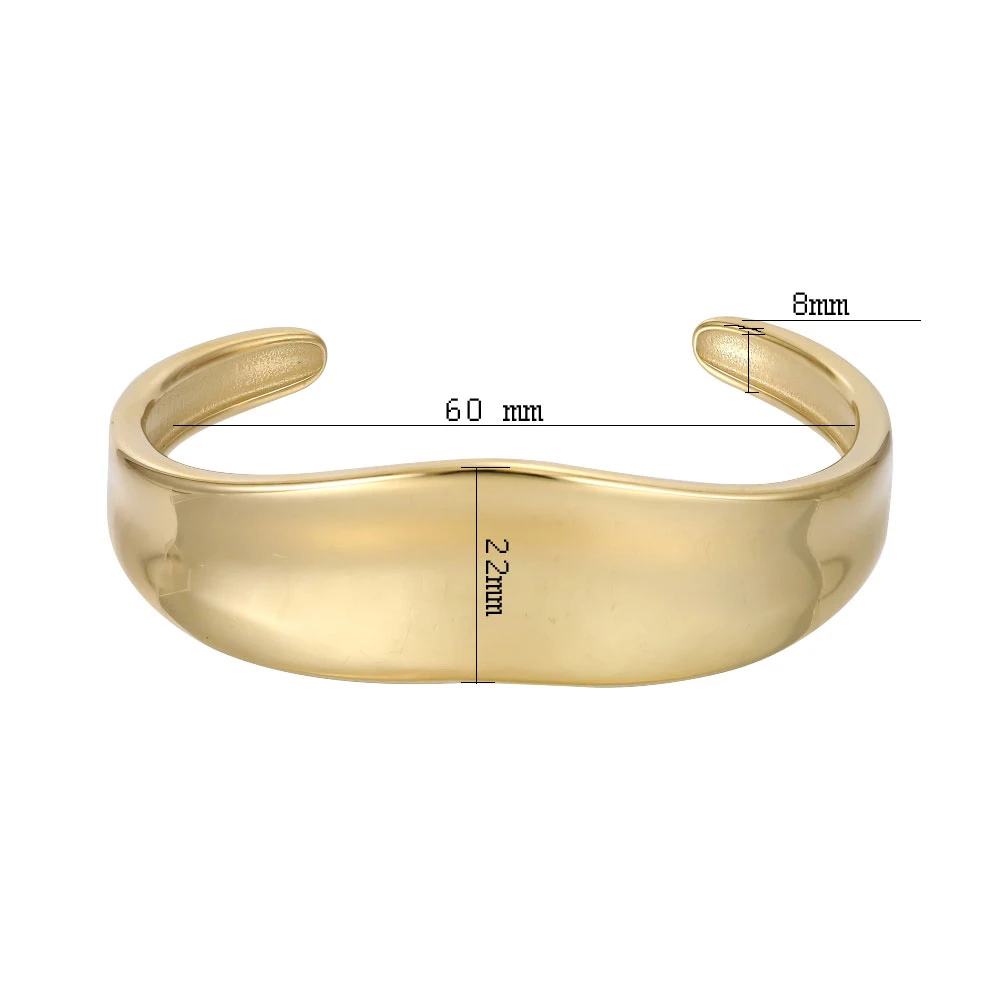 Pevný náramek bangle z chirurgické oceli nepravidelného tvaru. Povrch náramku je leštěný pozlacený technologií PVD. Střed náramku je široký 22mm, strany náramku jsou široké 8mm, vnitřní rozměry: šířka 60mm, výška 45mm. Rozměry náramku najdete zobrazené na podpůrné fotografii.