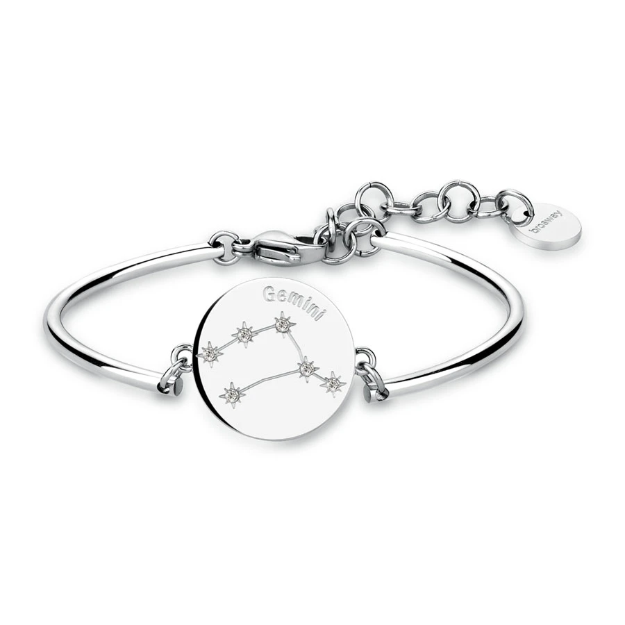 Ocelový náramek Brosway se znamením blíženců (23.5-20.6). Povrch náramku je leštěný. Hvězdy ze souhvězdí jsou zastoupeny zářivými krystaly Swarovski. Ozdoba náramku se znamením má průměr 17 mm. Náramek má karabinové zapínání. Délku náramku lze plynule nastavit v rozmezí 15-18 cm.