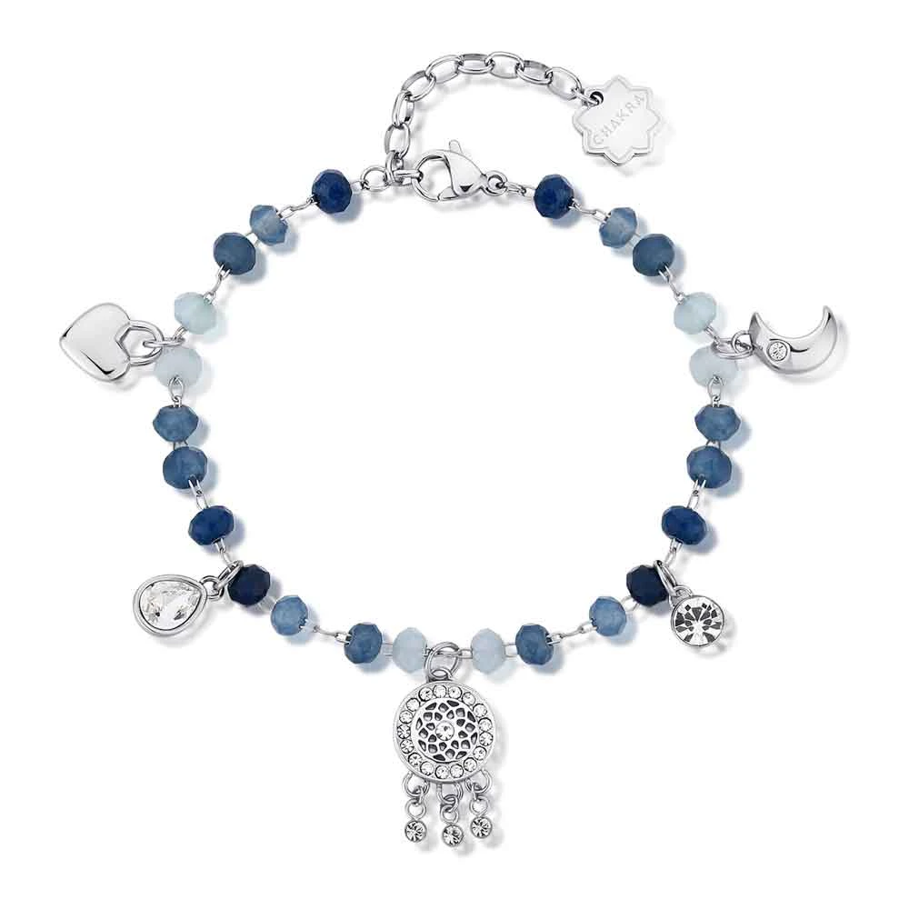 Dámský náramek z kolekce Chakra vyrobený z chirurgické oceli 316L. Povrch náramku je leštěný. Náhrdelník je ozdobený korálky z minerálu chalcedonu a zářivými krystaly. Délka náramku 18cm.