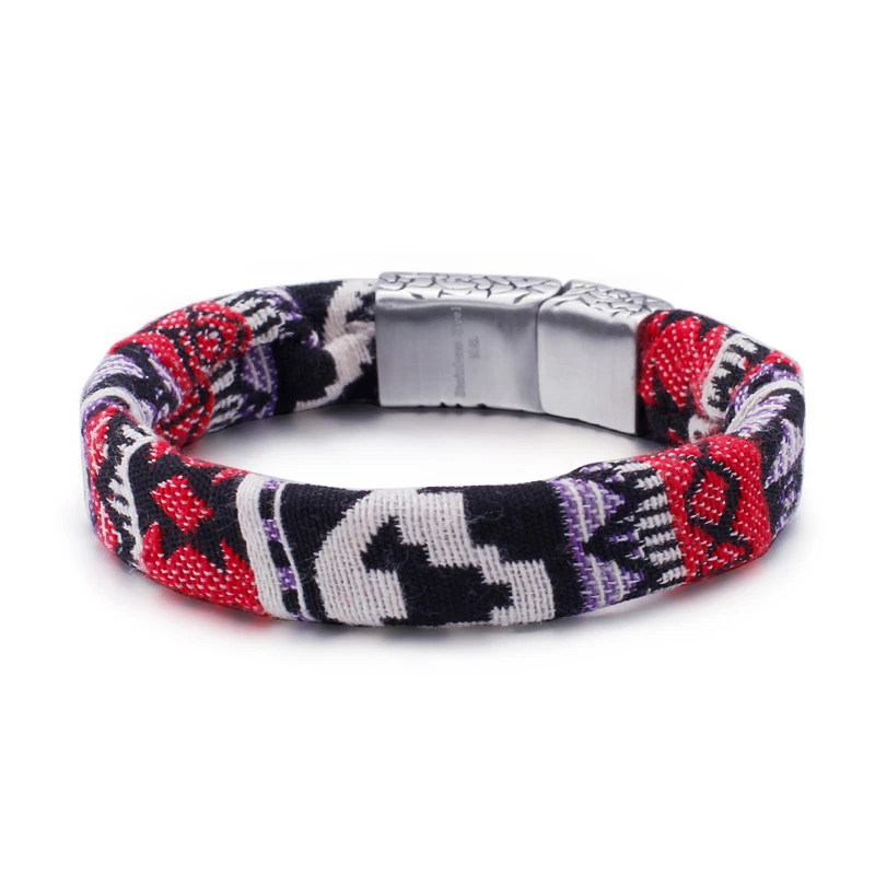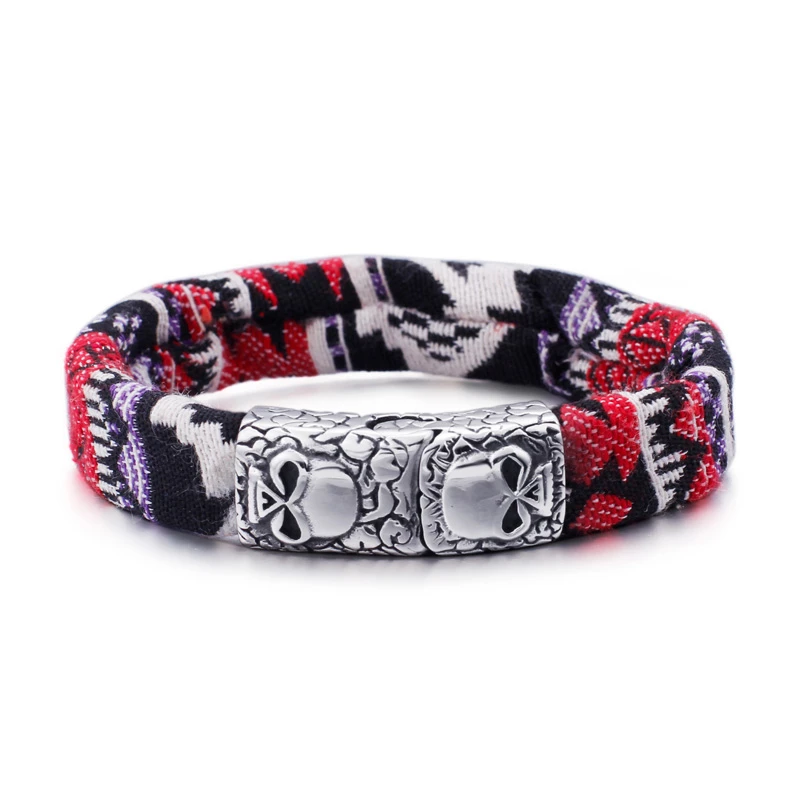 Netradiční pánský náramek na ruku z chirurgické oceli a bavlny. Náramek je dlouhý 21,5cm, šířka 14mm. Část náramku z chirurgické oceli je současně magnetické zapínání. Povrch zapínání je plastický se vzorem a dvěma lebkami.