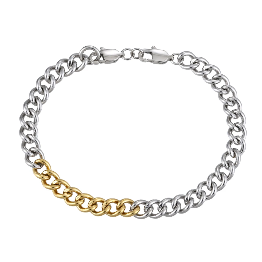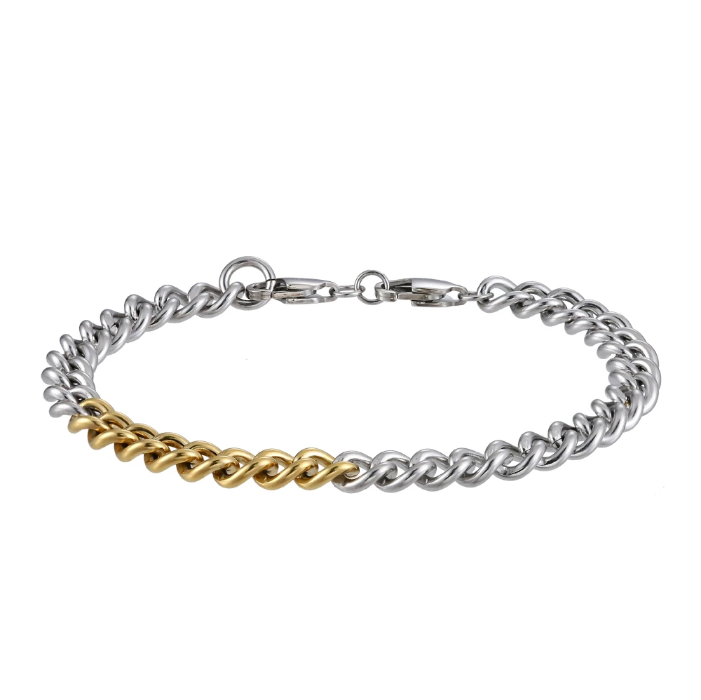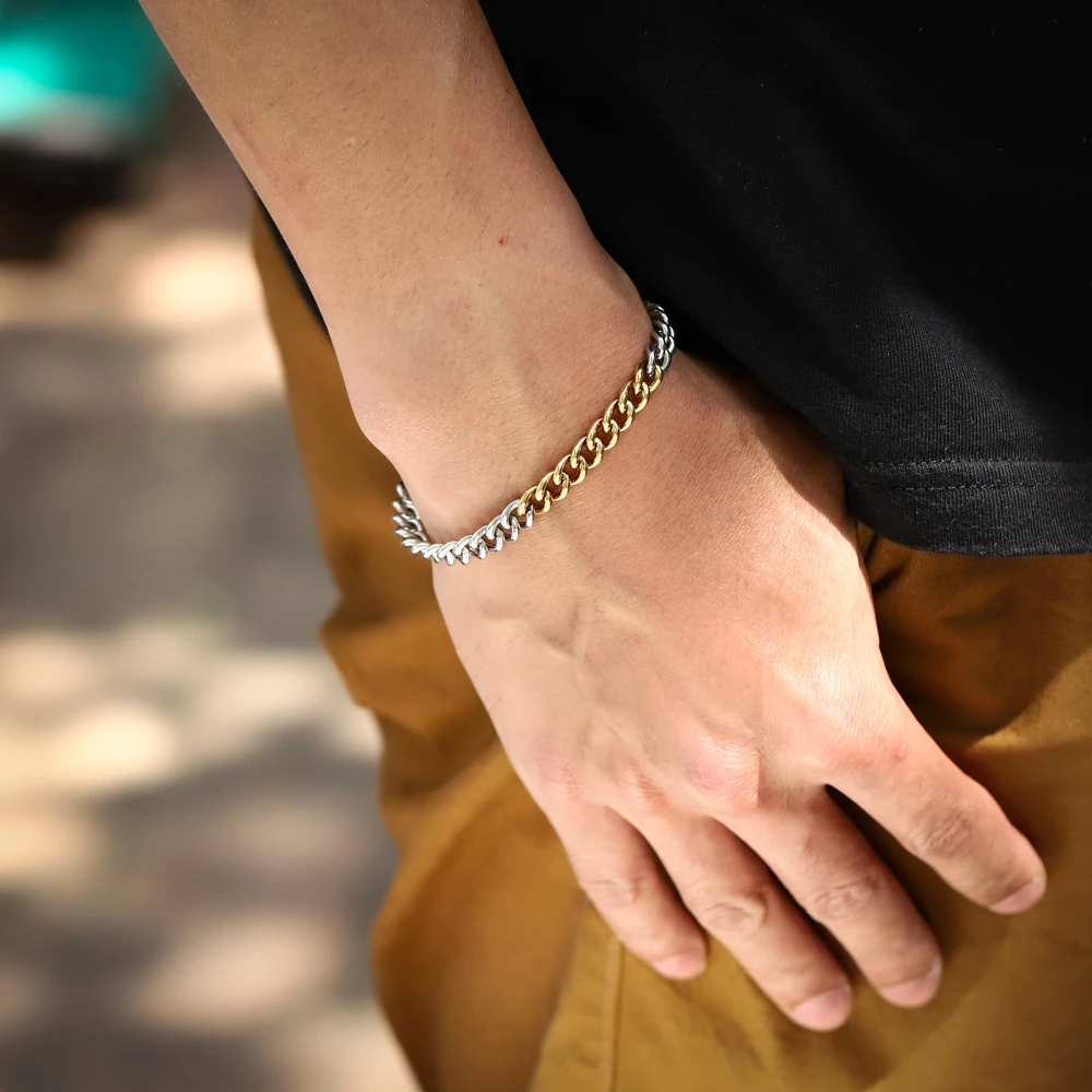 Náramek ruku z chirurgické oceli. Povrch náramku je leštěný částečně pozlacený technologií PVD. Díky dvojitému karabinovému zapínání lze délku náramku nastavit na 21cm, nebo 19cm.