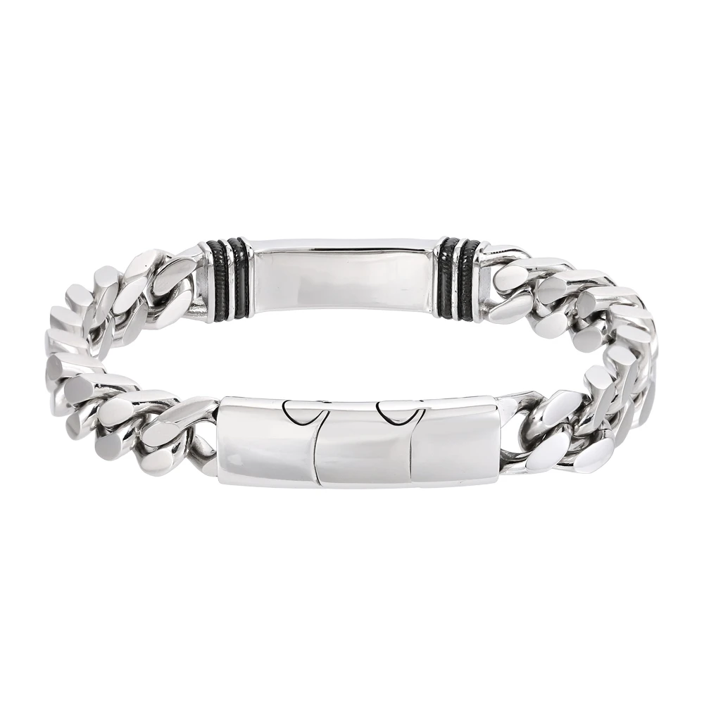 Pánský náramek na ruku z chirurgické oceli. Povrch náramku je leštěný. Destička s černými proužky má rozměr 42 x 12 mm Náramek je široký 12 mm, délku náramku lze díky chytrému zapínání nastavit v délkách 22 cm, nebo 21 cm. Díky použitému materiálu je náramek odolný proti poškrábání a nevyvolává alergické reakce, bez obav ho mohou nosit osoby s citlivou pokožkou.
