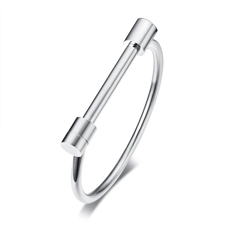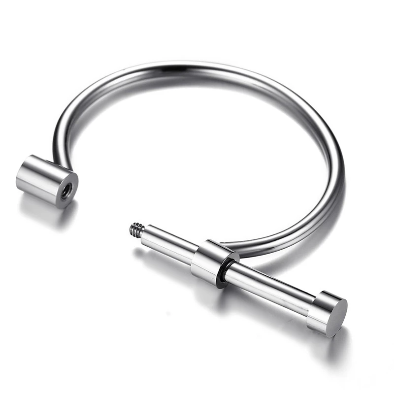 Netradiční pevný ocelový náramek na ruku. Povrch náramku je leštěný. Vnitřní velikost 60 mm. Tloušťka 4 mm, šroubovací část má průměr 5 mm.