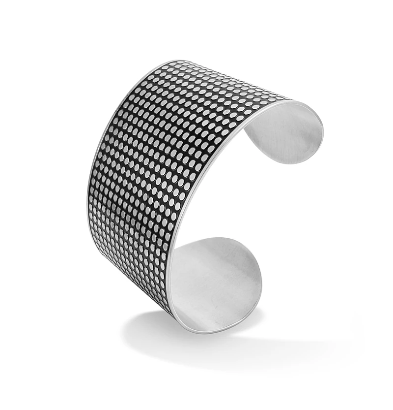 Náramek z chirurgické oceli 316l. Povrch náramku je leštěný kombinovaný s černou barvou. Vzor je plastický. Šíře 45mm, průměr 65mm.