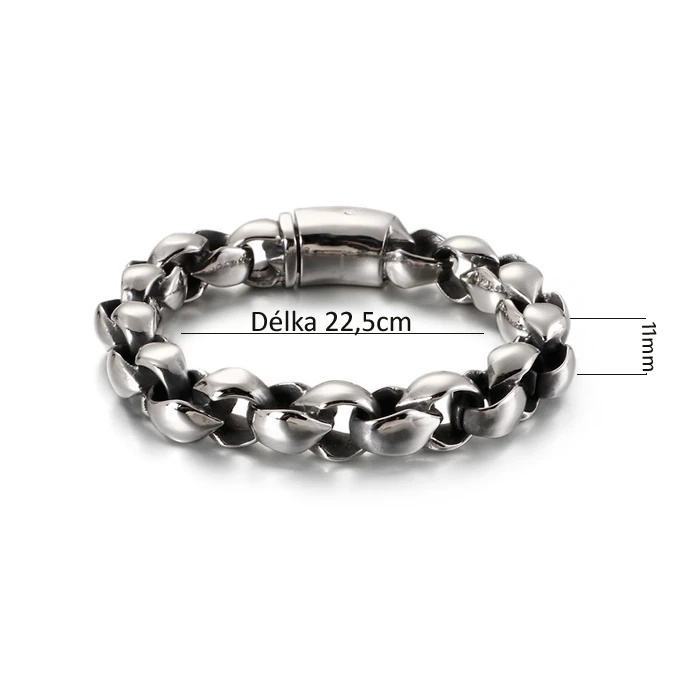 Ocelový náramek na ruku pro muže. Náramek má leštěný povrch. Délka náramku 22,5cm, průměr 11mm. Náramek má zapínání na masivní klip.