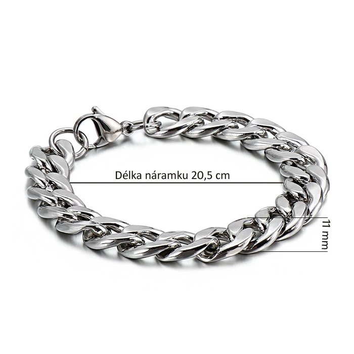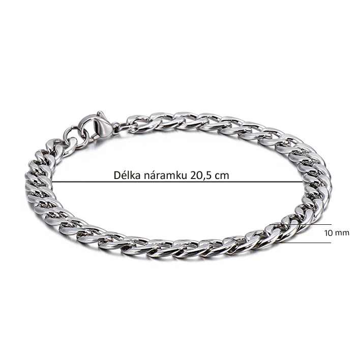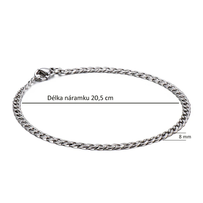 Řetízek na ruku z chirurgické vzor pancr. Řetízek má leštěný povrch. Zapínání náramku je na karabinu. Délka náramku 20,5 cm. Na přání je možné řetízek zdarma zkrátit.
