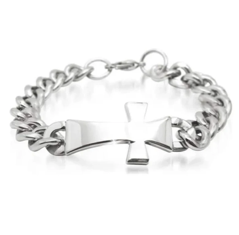 Náramek z chirurgické oceli s křížem. Kříž představuje symbol víry a odhodlání. Povrch náramku je leštěný. Kříž má rozměr 50x20mm. Řetízkové části náramku jsou široké 11mm.Náramek z chirurgické oceli dlouhý 21cm. Délku náramku lze na přání zdarma zkrátit.