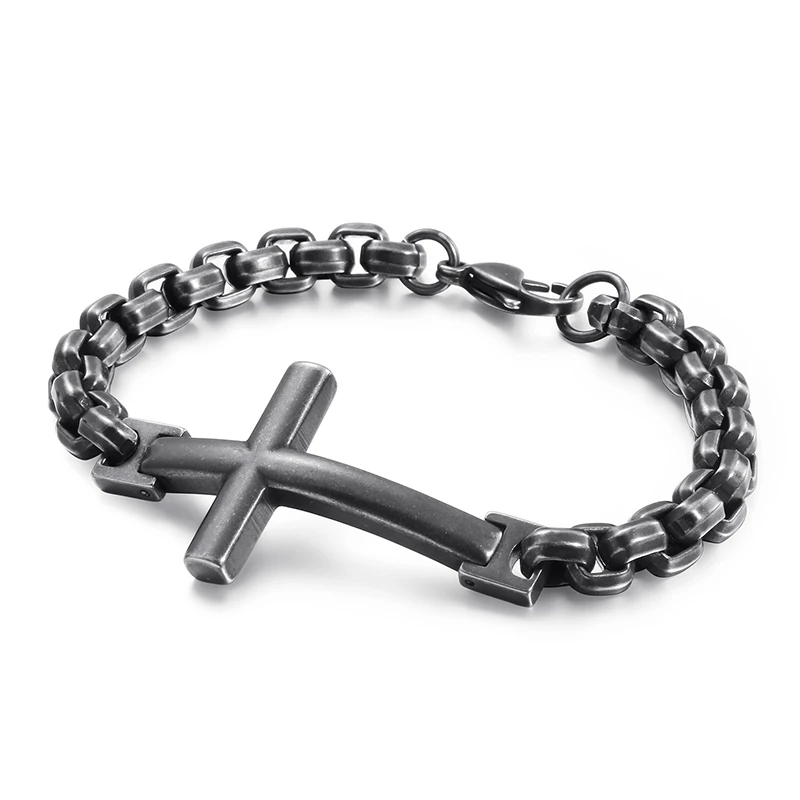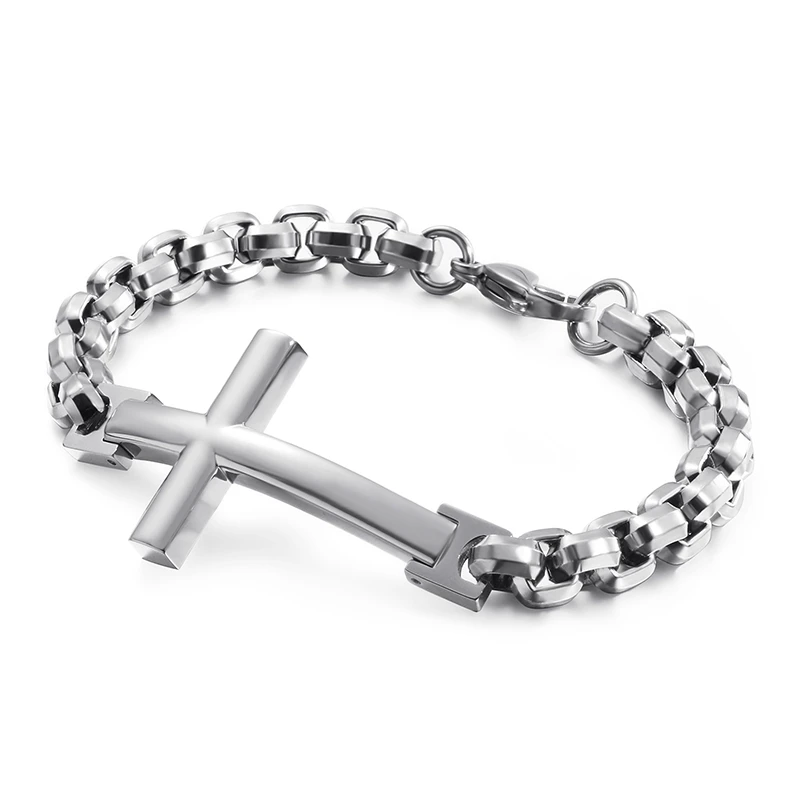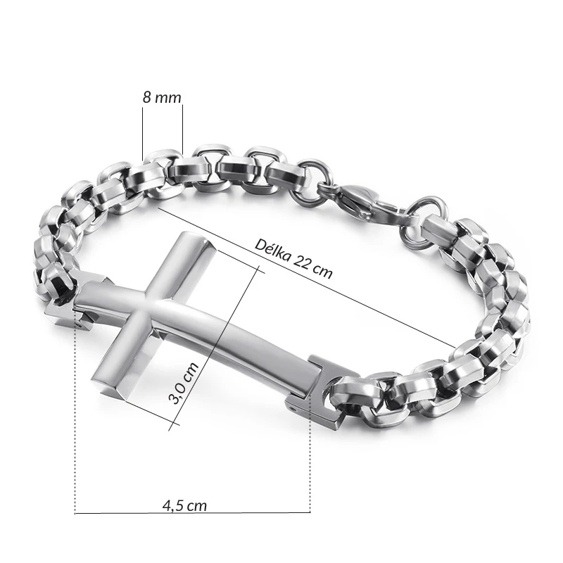 Náramek z chirurgické oceli s křížkem. Povrch náramku je leštěný. Náramek je dlouhý 22 cm. Průměr řetízku 8 mm. Rozměr kříže 4,5 x 3,0 cm. Zapínání náramku je karabinové.