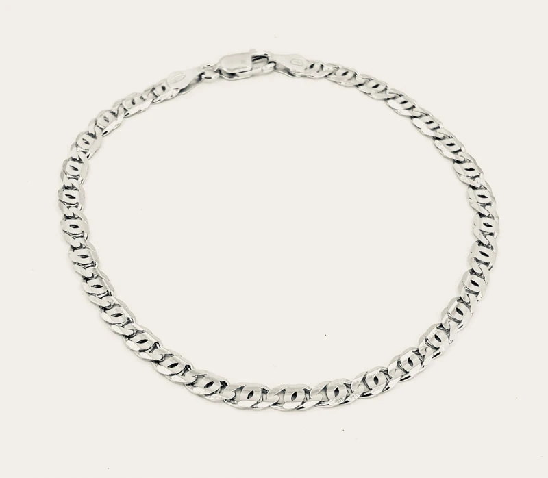 Náramek z kvalitního stříbra 925/1000 s porhodiovaným povrchem. Úprava povrchu rhodiováním dodává náramku jasnou barvu s leskem, potlačuje alergické reakce a chrání povrch náramku před poškrábáním. Díky této úpravě bude mít povrch náramku dlouhou dobu bezvadný vzhled a šperk mohou bez obav nosit i osoby s citlivou pokožkou. Náramek je široký 4mm. Zapínání náramku je karabinové.