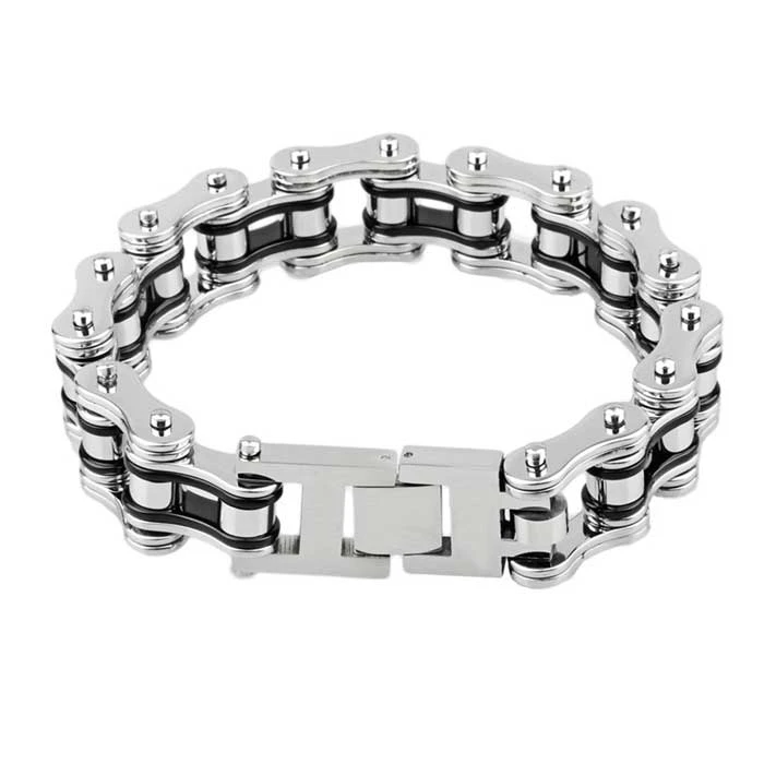 Ocelový náramek pro motorkáře imitující motocyklový řetěz. Povrch náramku je leštěný s vnitřními černými články. Šířka náramku 16mm, délka náramku 22,5cm.