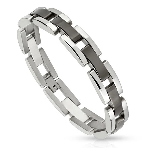 Náramek z chirurgické oceli 316L. Povrch je leštěný kombinovaný s černou PVD barvou. Náramek je široký 12mm, délka 21cm.