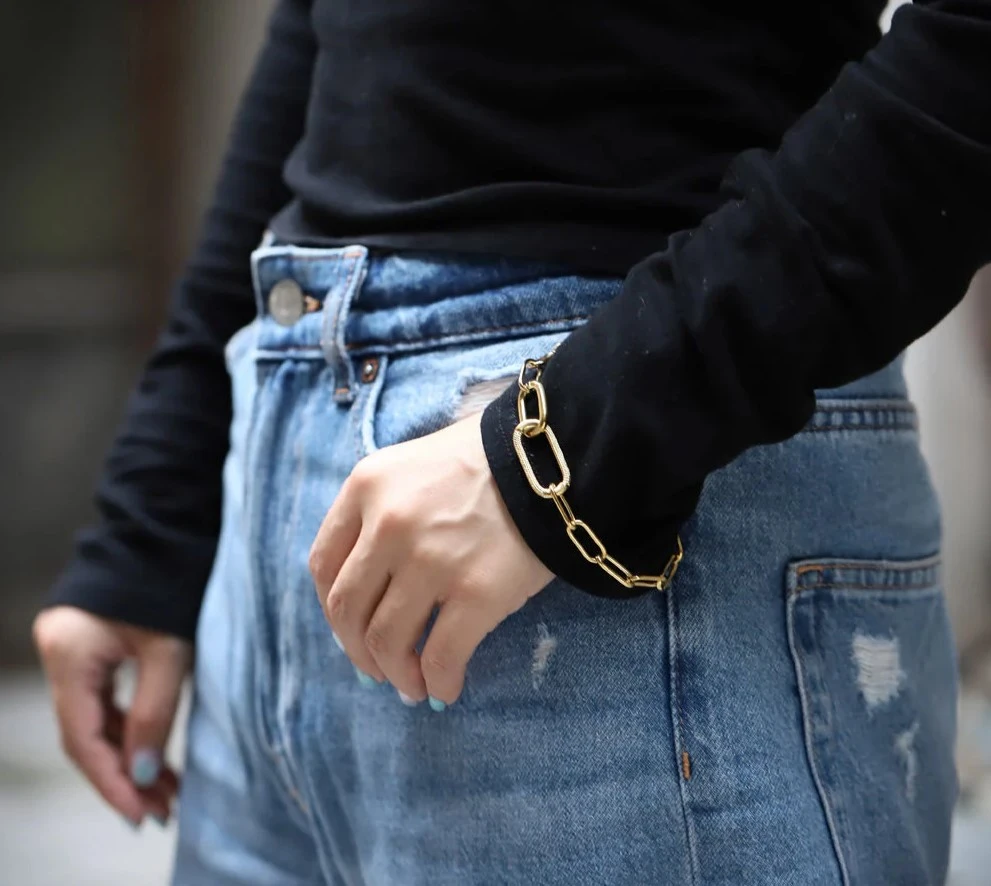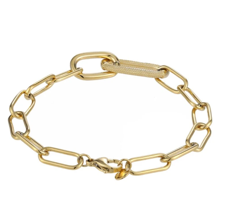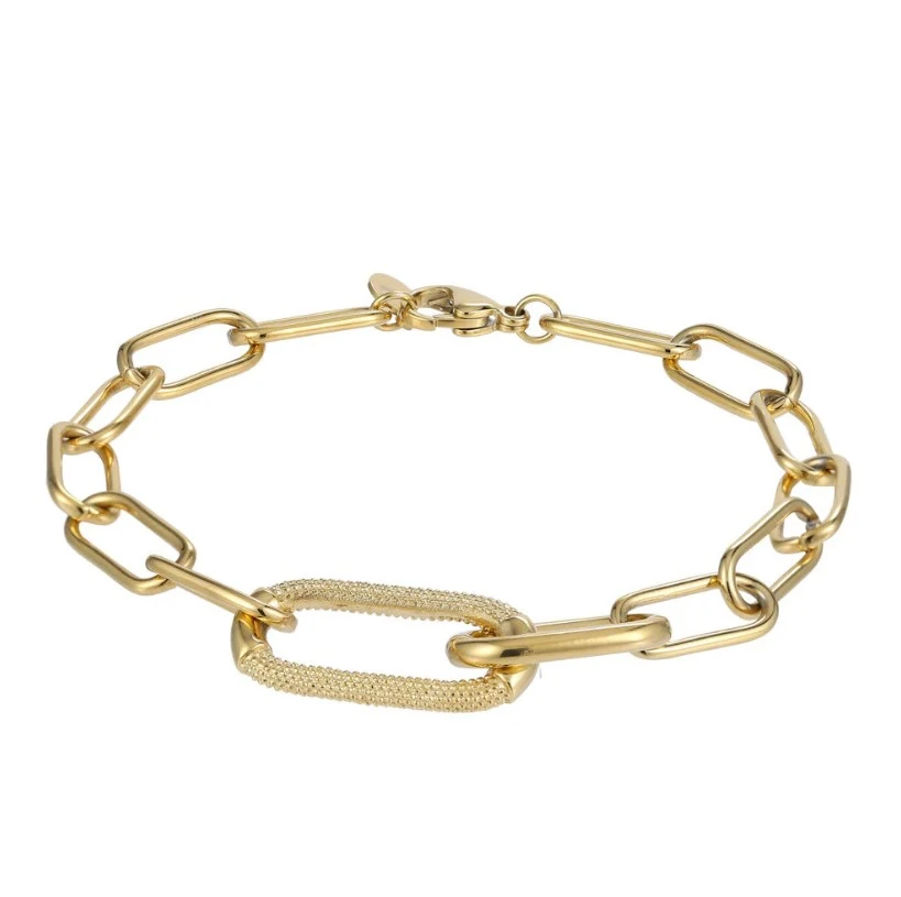 Náramek z chirurgické oceli pro ženy a dívky s leštěným pozlaceným povrchem. Elegantní nadčasový náramek, který díky kvalitní chirurgické oceli vydrží dlouhou dobu. Velké očko ve středu náramku má rozměr 27x13mm, ostatní očka mají rozměr 16x8mm. Náramkové zapínání je karabinové, délka náramku 21 cm.