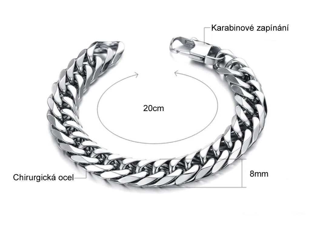 Náramek na ruku z chirurgické oceli. Povrch náramku je leštěný. Náramek se zapíná pomocí karabiny. Délka náramku 20 cm, šířka 8 mm. Na přání je možné náramek zdarma zkrátit.
