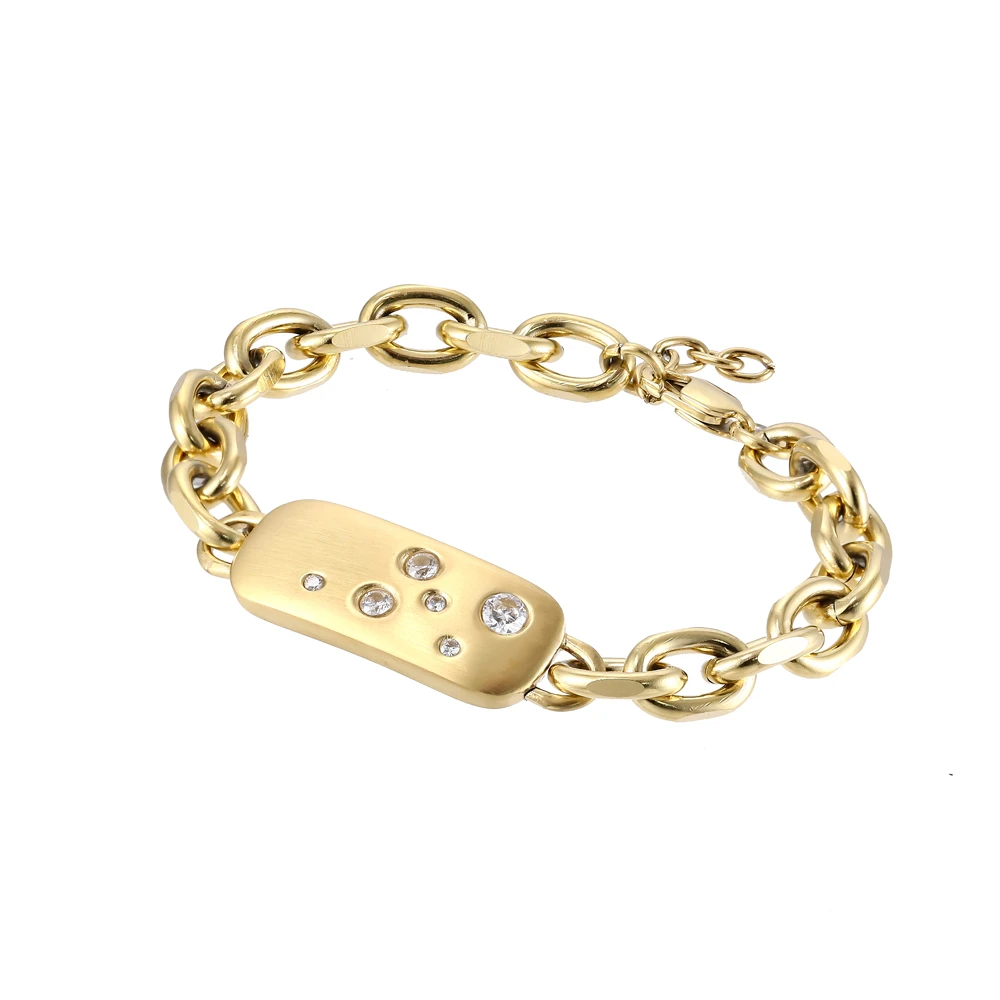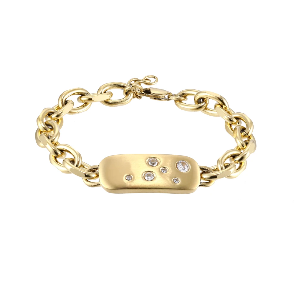Náramek z chirurgické oceli s povrchem pozlaceným technologií PVD. Destička má matnou povrchovou úpravu, řetízkové části náramku jsou leštěné. Destička je ozdobená zářivými zirkony. Rozměr destičky 13x32mm, očka jsou široká 8mm. Délku náramku lze nastavit v rozmezí 19-21cm.