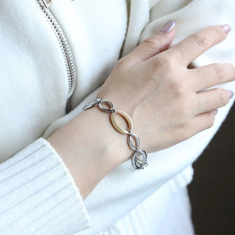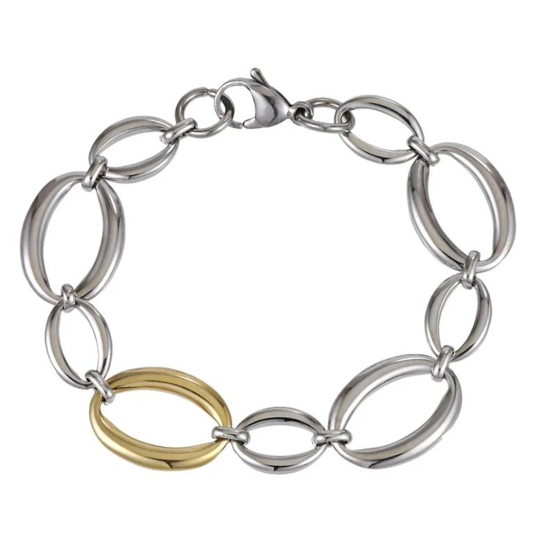 Náramek pro ženy z chirurgické oceli s leštěným povrchem. Povrch jednoho článku je pozlacený žlutým 14K zlatem. Větší články náramku jsou široké 15mm, menší články jsou široké 10mm, náramek je dlouhý 19cm. Zapínání náramku je karabinové. Elegantní nadčasový náramek, který díky kvalitní chirurgické oceli vydrží dlouhou dobu.