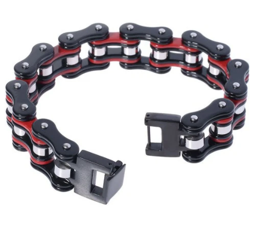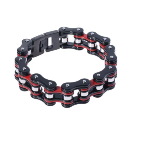 Pánský náramek z chirurgické imitující motocyklový řetěz. Barevné části náramku jsou barvené na červenou a černou technologií PVD. Náramek je široký 16mm, délka náramku 22,5cm.
