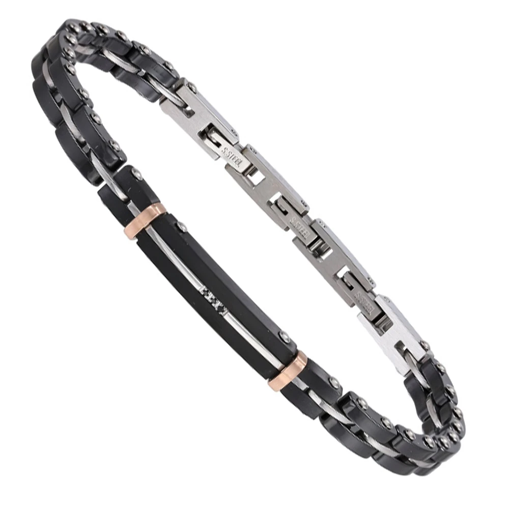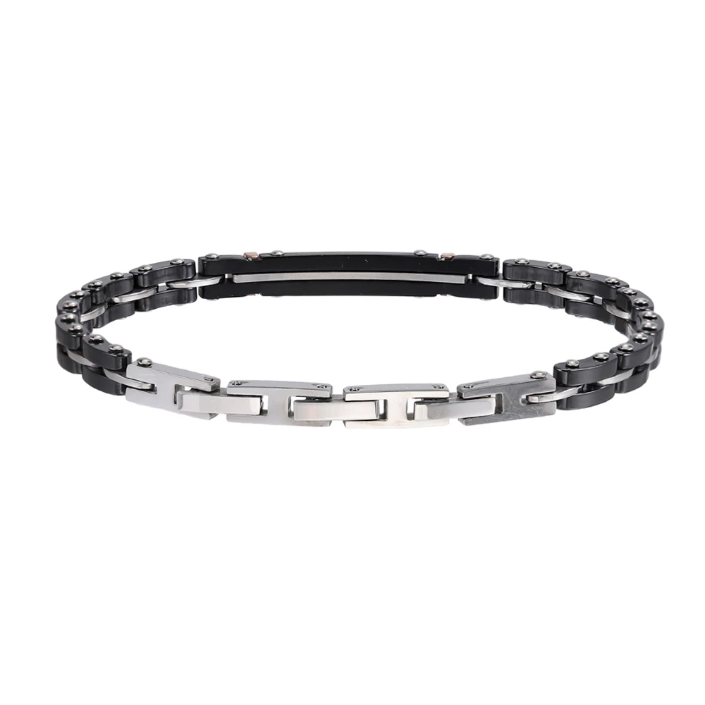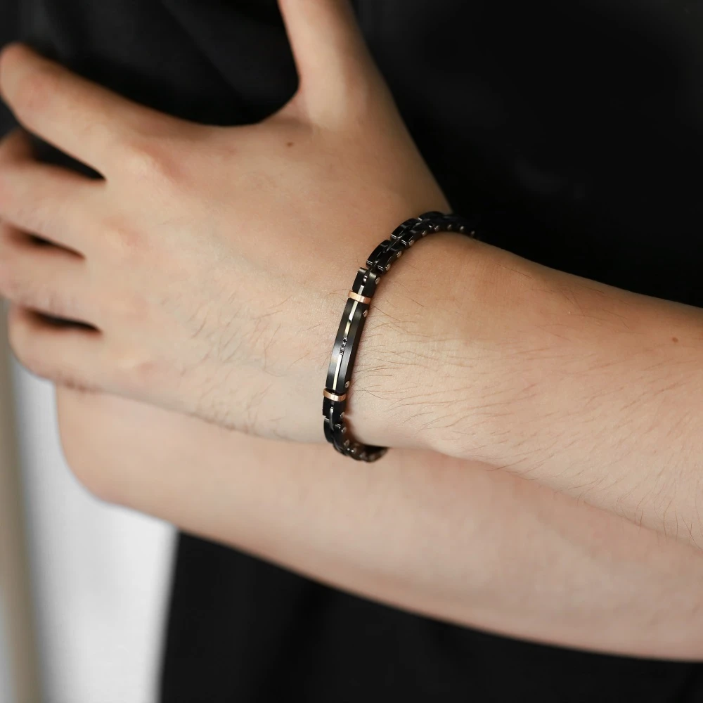 Náramek z chirurgické oceli a keramiky. Náramek má leštěný povrch, černá keramika dodává náramku luxusní vzhled. Díky trojitému zapínání lze náramek zapnout na úrovni délek 19,5cm, 20,5cm 21,5cm. Náramek je široký 7mm.