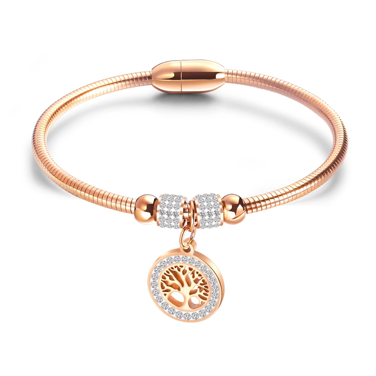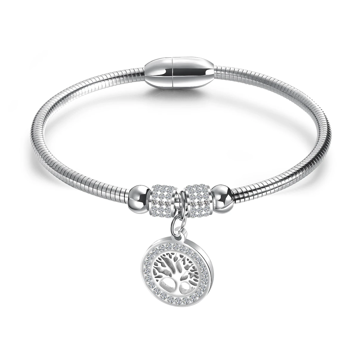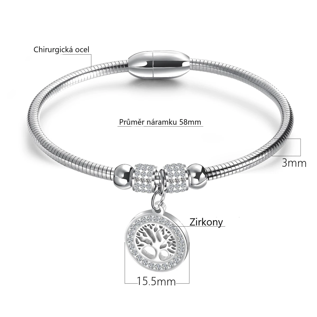 Ocelový pevný dámský náramek s ozdobou stromu života. Náramek má magnetické zapínání. Korálky a ozdoba stromu života jsou osazené zirkony. Vnitřní průměr náramku 58mm, šířka náramku 3mm.