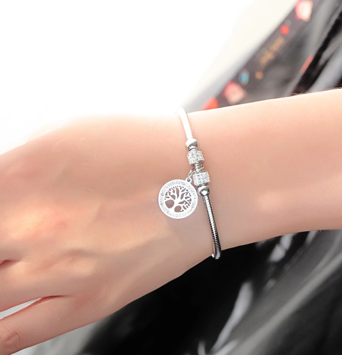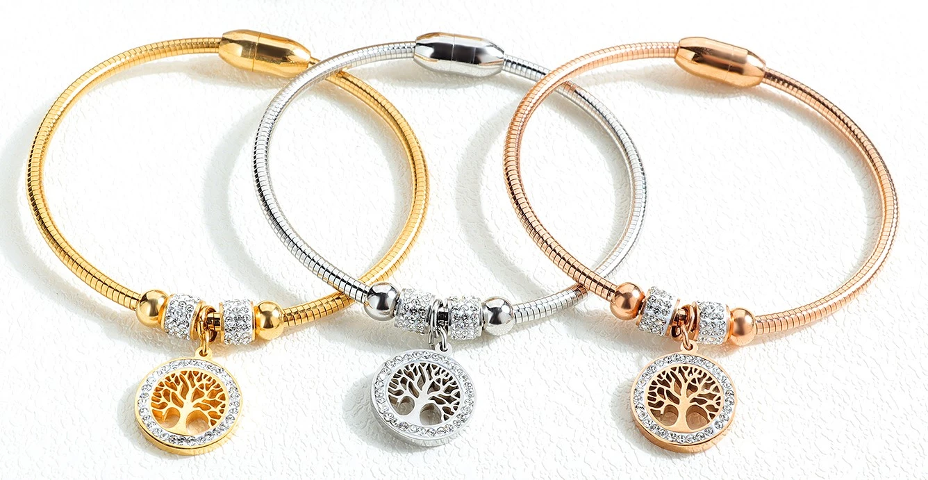 Pevný ocelový náramek pro ženy s ozdobou stromu života. Elegantní náramek z chirurgické oceli,který má stejné vlastnosti, pro které se ocelové šperky stále těší značné oblibě. Mezi tyto vlastnosti patří především nevyvolávání alergických reakcí, šperky z chirurgické oceli jsou odolné proti poškození, neoxidují a jsou barevně stálé.