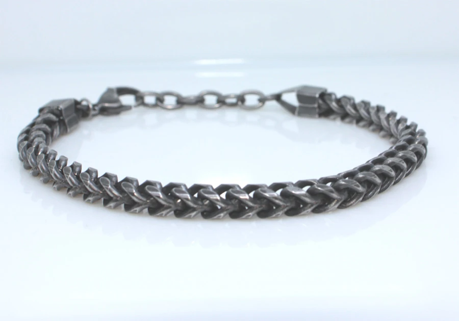 Ocelový náramek na ruku z chirurgické oceli. Povrch náramku je upravený na barvu pistolové šedi. Náramek má čtvercový tvar 5x5mm. Délku náramku lze nastavit v rozmezí 18-21cm.