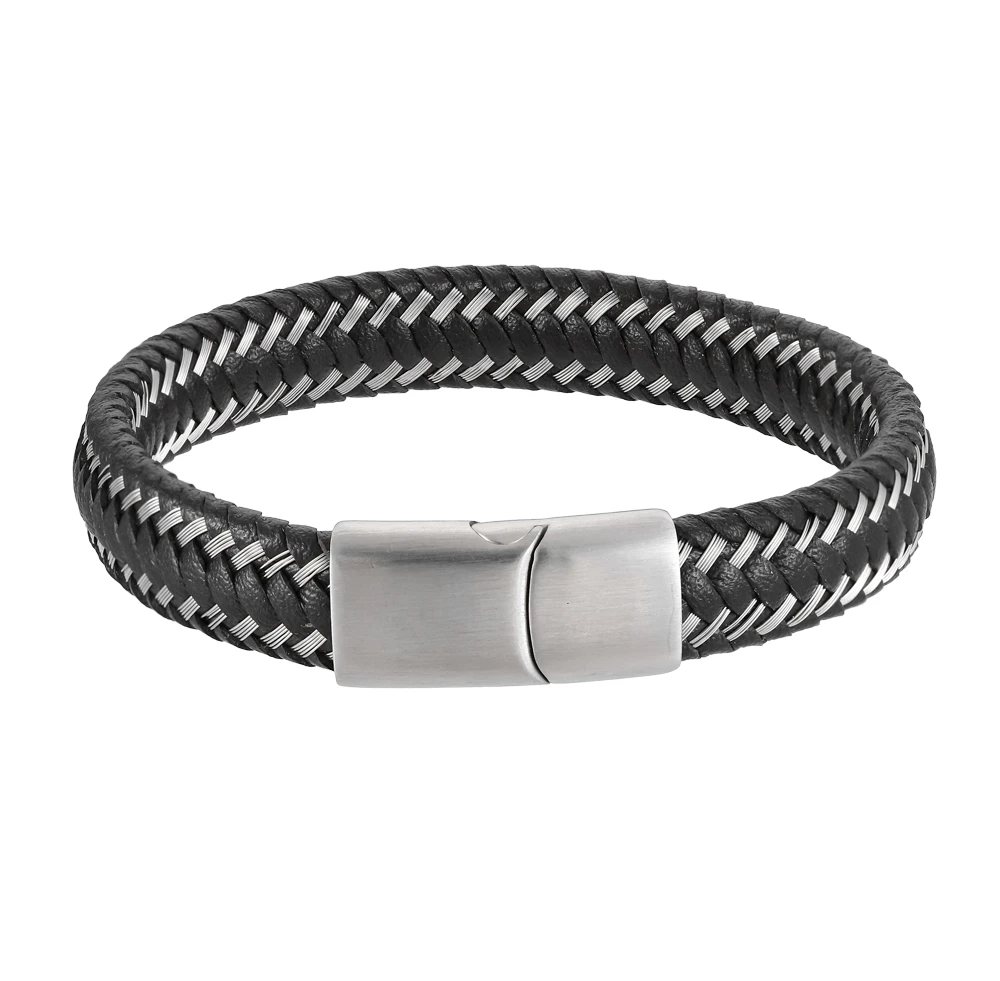 Náramek na ruku z pravé kůže a chirurgické oceli pro muže. Mezi kožené části náramku je zapletený jemný ocelový řetízek. Náramek je široký 12 mm, délka náramku 22 cm. Zapínání náramku je magnetické.