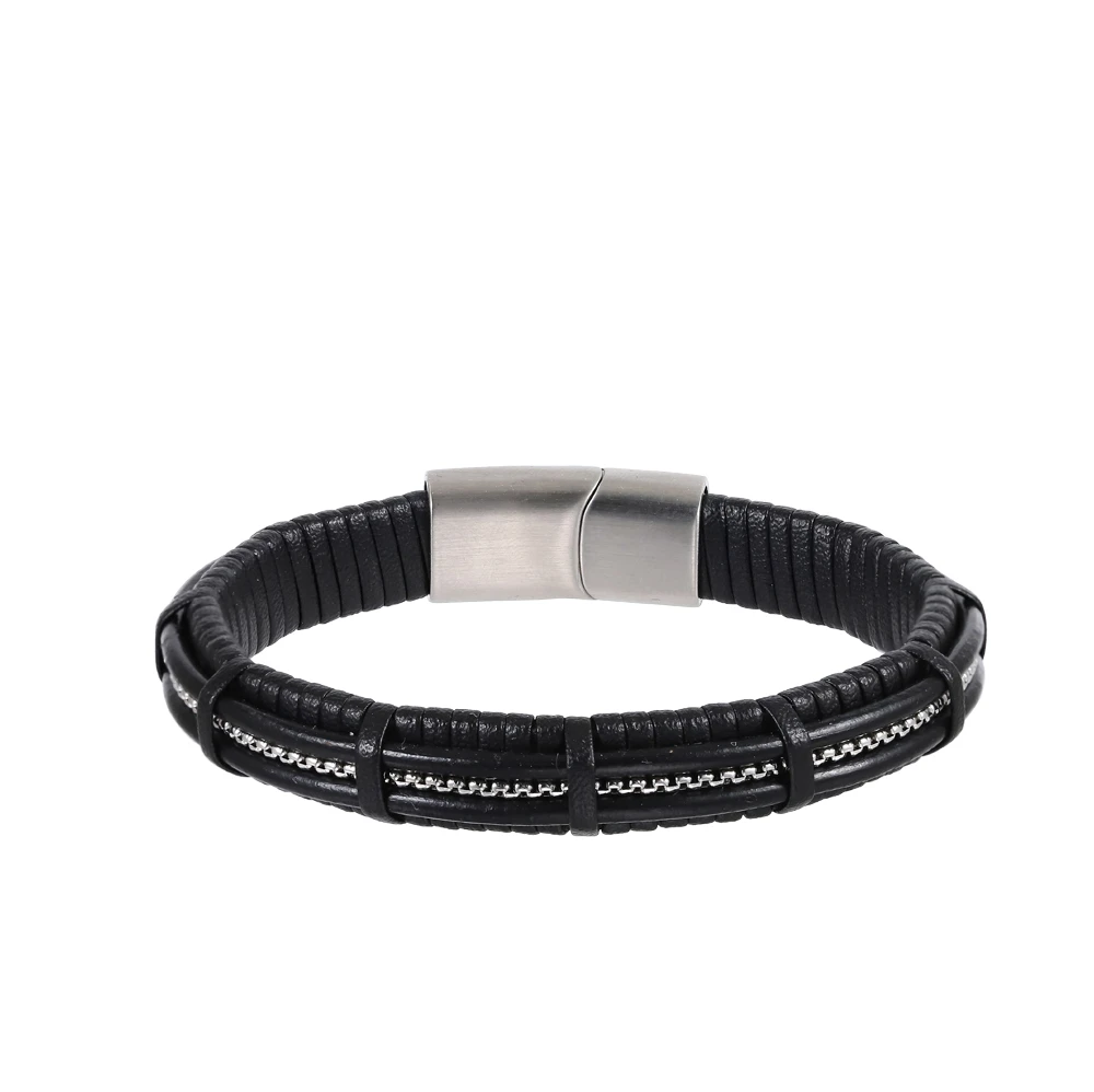 Náramek na ruku z pravé kůže a chirurgické oceli pro muže. Mezi kožené části náramku je zapletený jemný ocelový řetízek. Náramek je široký 12 mm, délka náramku 21 cm. Zapínání náramku je magnetické.