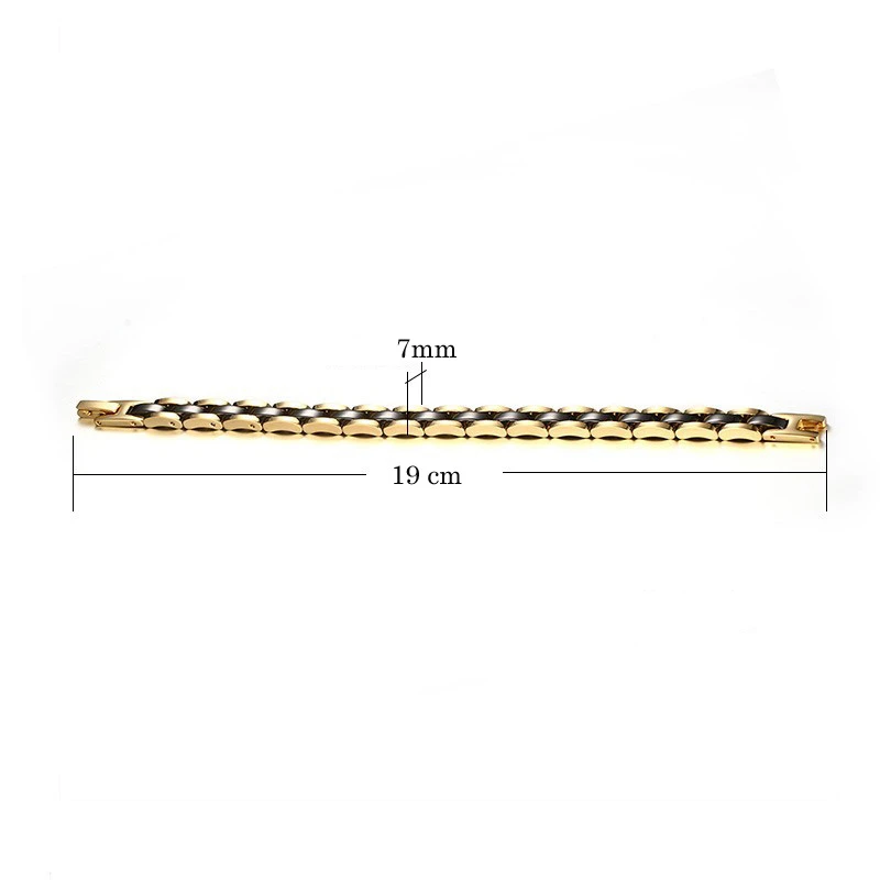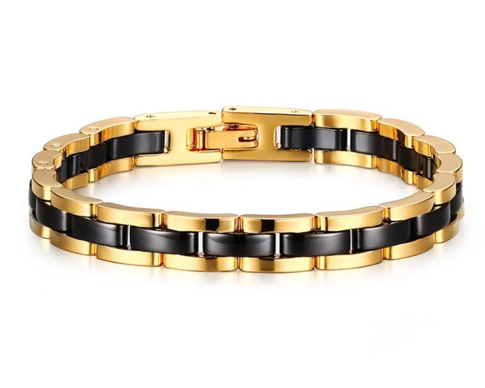 Dámský náramek z wolframu a keramiky. Wolframové části náramku jsou pozlacené technologií PVD, keramické články náramku jsou černé. Celý povrch náramku je leštěný. Náramek je široký 7mm, délka náramku 19cm. Na přání lze náramek zdarma zkrátit.