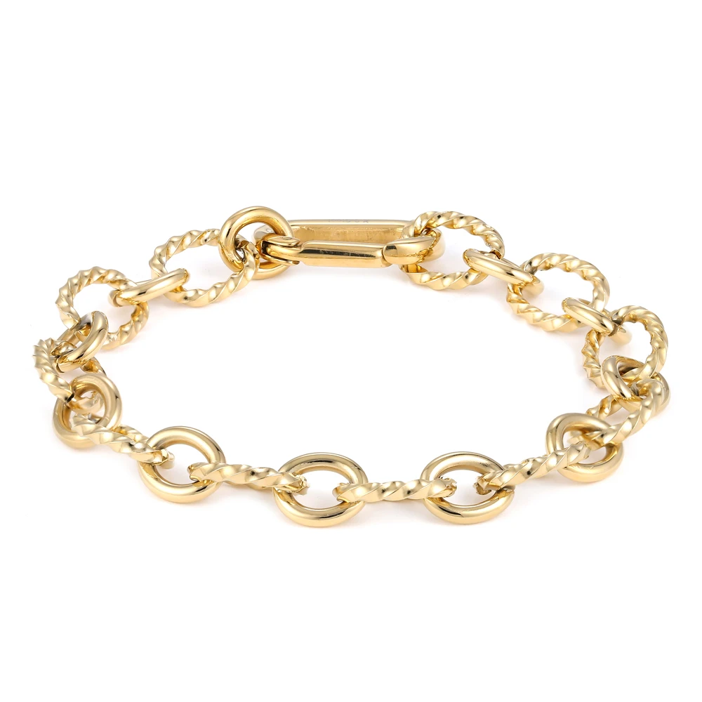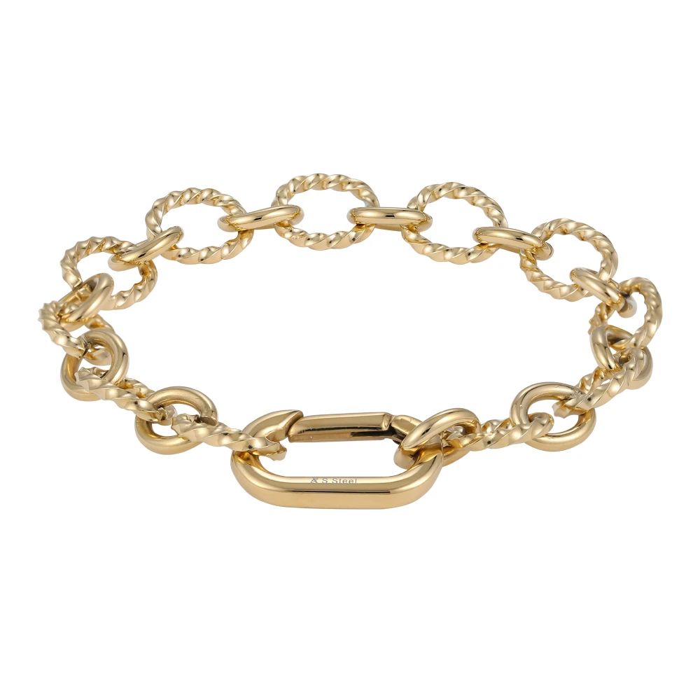 Pozlacený dámský náramek z chirurgické oceli. Náramek je pozlacený technologií PVD. Hladká očka náramku jsou široká 8mm, očka se vzorem jsou široká 10mm. Ozdobné karabinové zapínání má rozměr 22x13mm. Na přání lze délku náramku zdarma zkrátit.