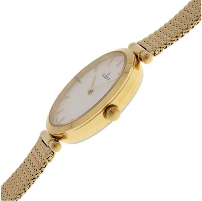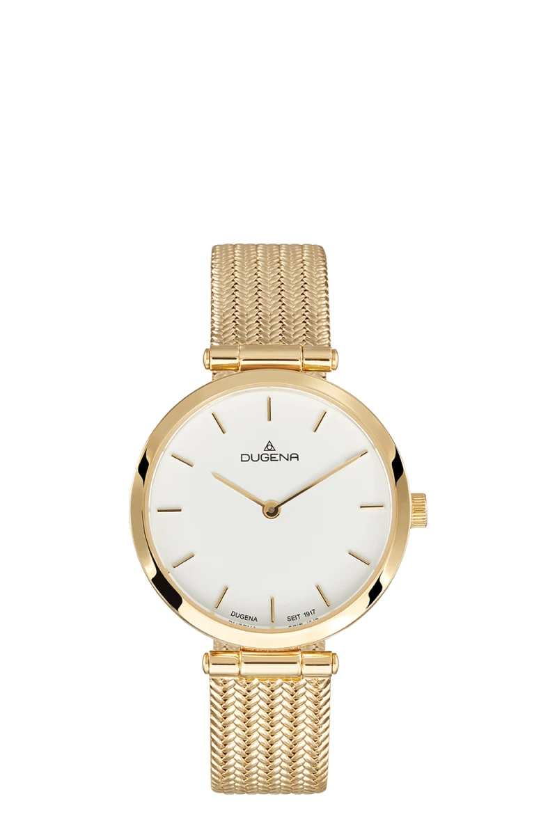Dámské náramové hodinky Dugena z chirurgické oceli s milánským tahem, sklíčko hodinek je minerální. Kulatý bílý ciferník s indexy. Hodinky jsou vybavené hodinovou a minutovou ručkou. Velikost pouzdra 32 mm. Povrch hodinek je pozlacený žlutým zlatem technologií PVD. Chod hodinek zajišťuje spolehlivý bateriový strojek. Hodinky jsou vodotěsné na úrovni 3 ATM. Na všechny dámské hodinky Dugena platí záruka v délce 36 měsíců. Hodinky jsou dodávané v dárkové krabičce s logem.