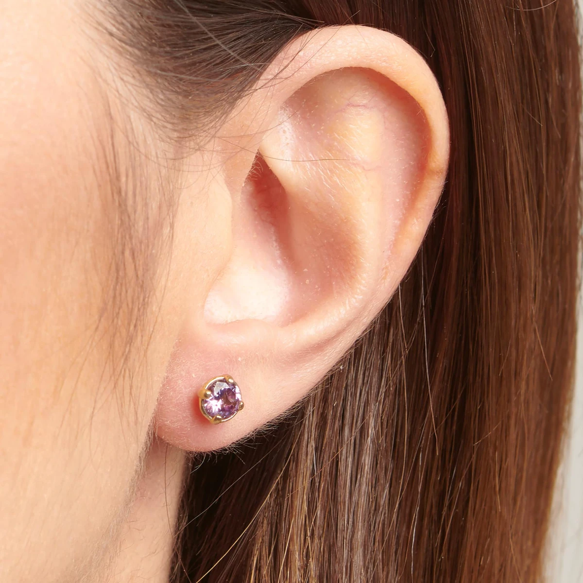 Ocelové dámské náušnice pecky z kolekce Desideri. Povrch náušnic je pozlacený technologií PVD. Pecky zdobí zářivé fialové zirkony. Průměr náušnic 6mm. Náušnicové zapínání je na puzetky.