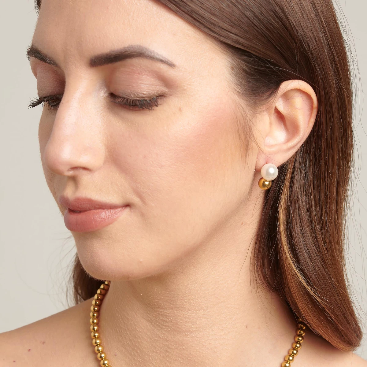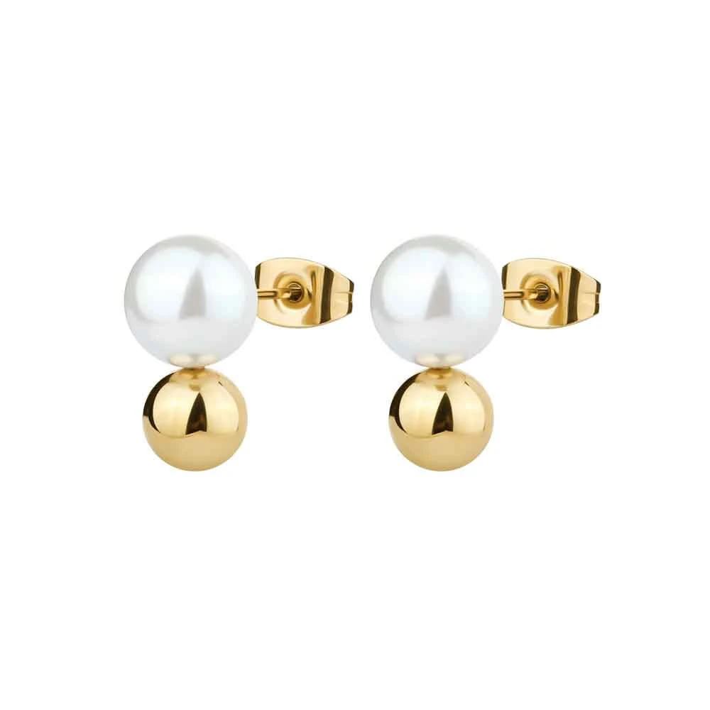 Dámské moderní náušnice z chirurgické oceli 316L zdobené mořskou perlou. Povrch náušnic je pozlacený technologií IP. Náušnice jsou dlouhé 18mm. Zapínání náušnic je na puzety.