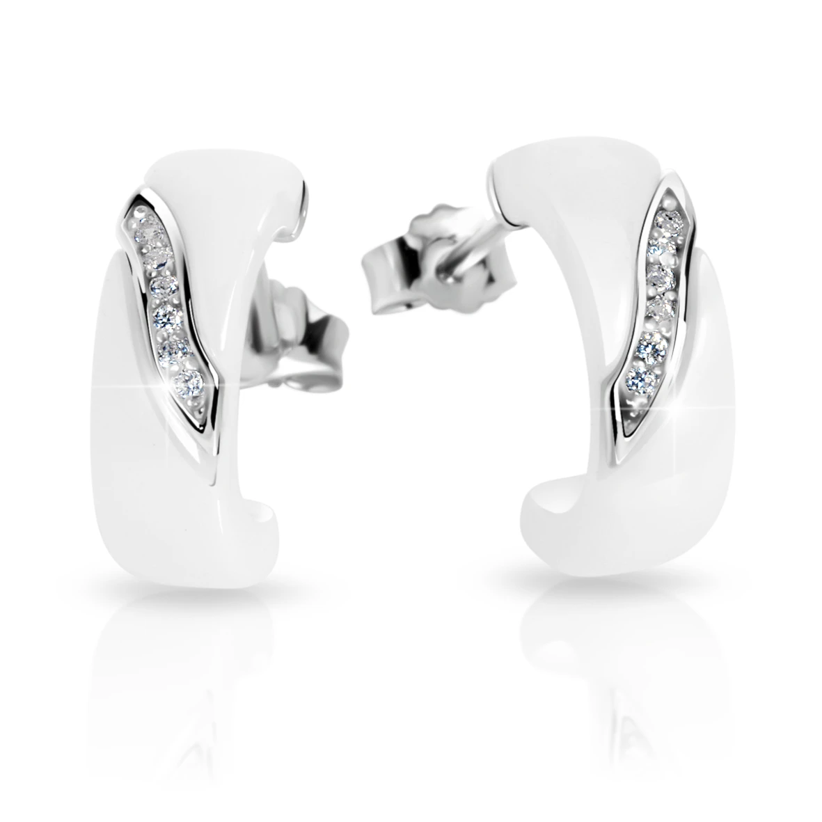 Náušnice z keramiky a stříbra 925/1000. Do keramiky je vložena stříbrná ozdoba osazená zirkony. Povrch stříbrné ozdoby je porhodiovaný. Nanesené rhodium dodává ozdobě jasnou barvu s leskem a současně zaručuje dlouhotrvající bezchybný vzhled šperku. Náušnice jsou dlouhé 13 mm, šířka 4 mm. Náušnicové zapínání je na puzety.