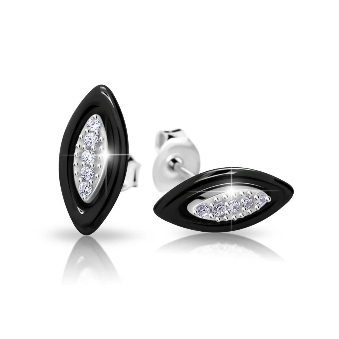 Náušnice z keramiky a stříbra 925/1000. Do keramiky je vložena stříbrná ozdoba osazená zirkony. Povrch stříbrné ozdoby je porhodiovaný. Nanesené rhodium dodává ozdobě jasnou barvu s leskem a současně zaručuje dlouhotrvající bezchybný vzhled šperku. Rozměr náušnic 14x6mm. Náušnicové zapínání je na puzety.