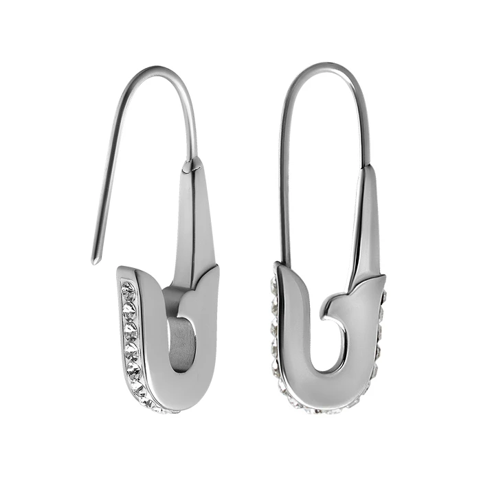 Náušnice z chirurgické oceli. Náušnice napodobují spínací špendlík. Zapínání špendlíku je ozdobené krystaly Swarovski. Rozměr: 52×15mm.