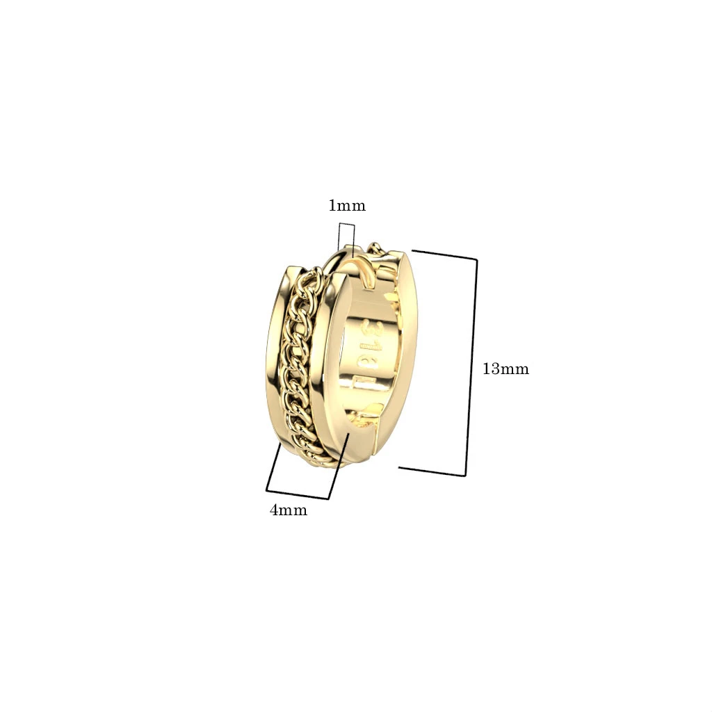 Náušnice z chirurgické oceli kroužky s řetízkem. Povrch náušnic je leštěný. Náušnice jsou široké 4mm, vnější průměr 13mm. Rozměry náušnic najdete vyobrazené na podpůrné fotografii.