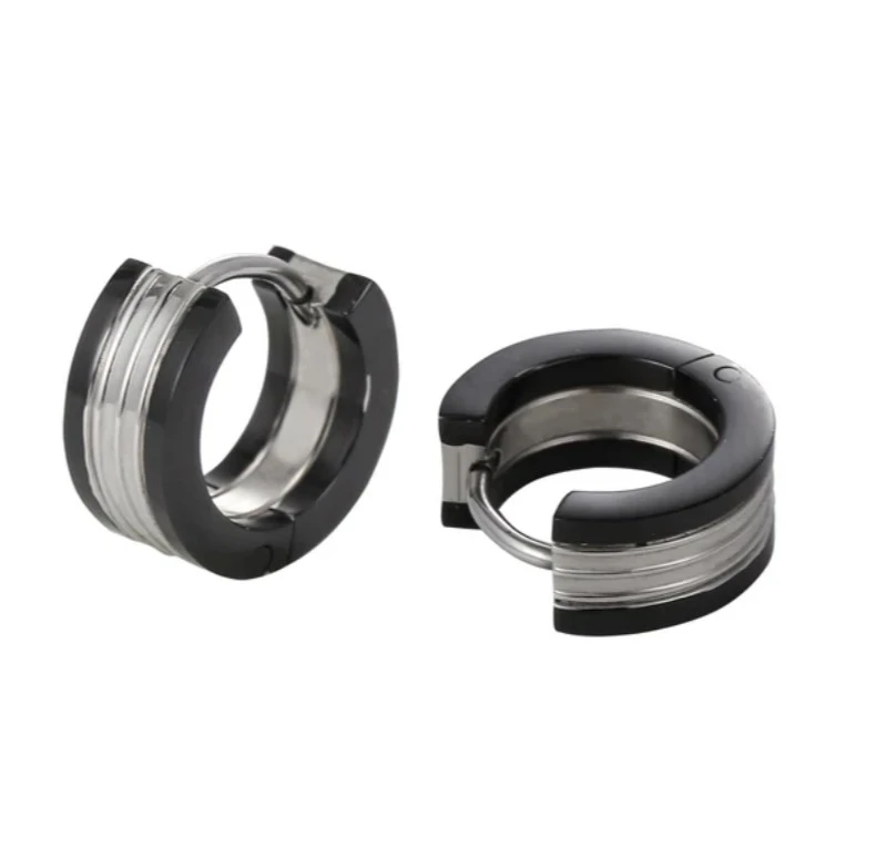 Náušnice z chirurgické oceli kroužky. Náušnice mají leštěný střed s černými okraji. Náušnice jsou široké 6mm, vnější průměr náušnic 14mm. Náušnicové zapínání je na kloub. Uvedená cena platí za pár.