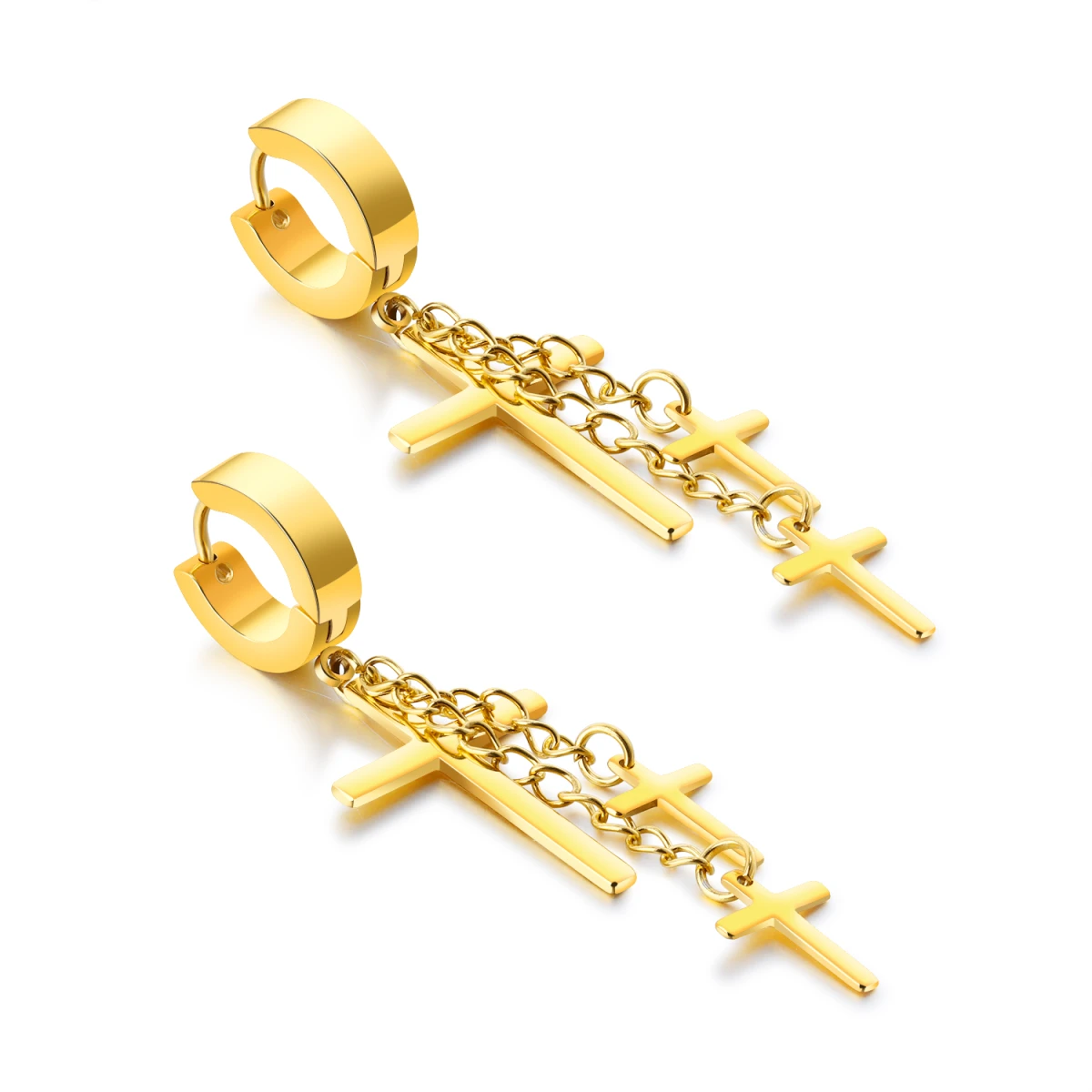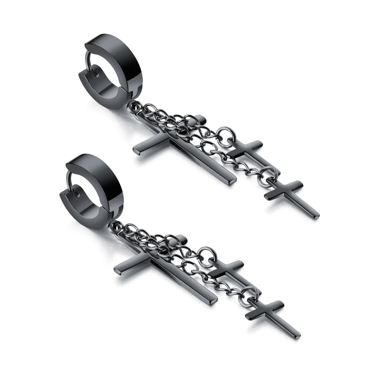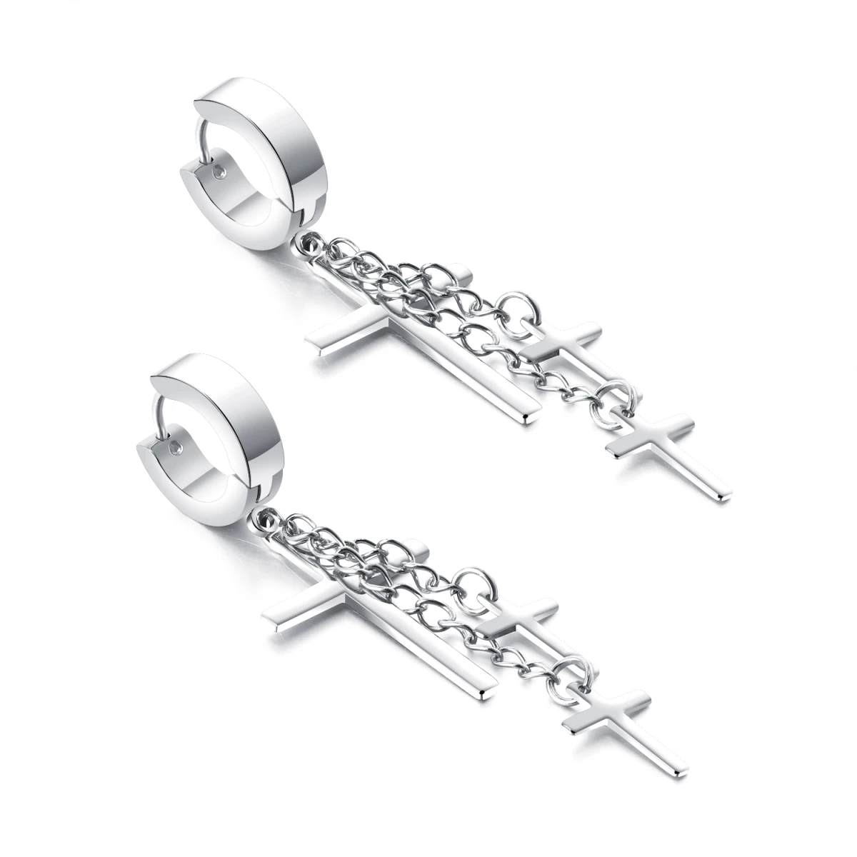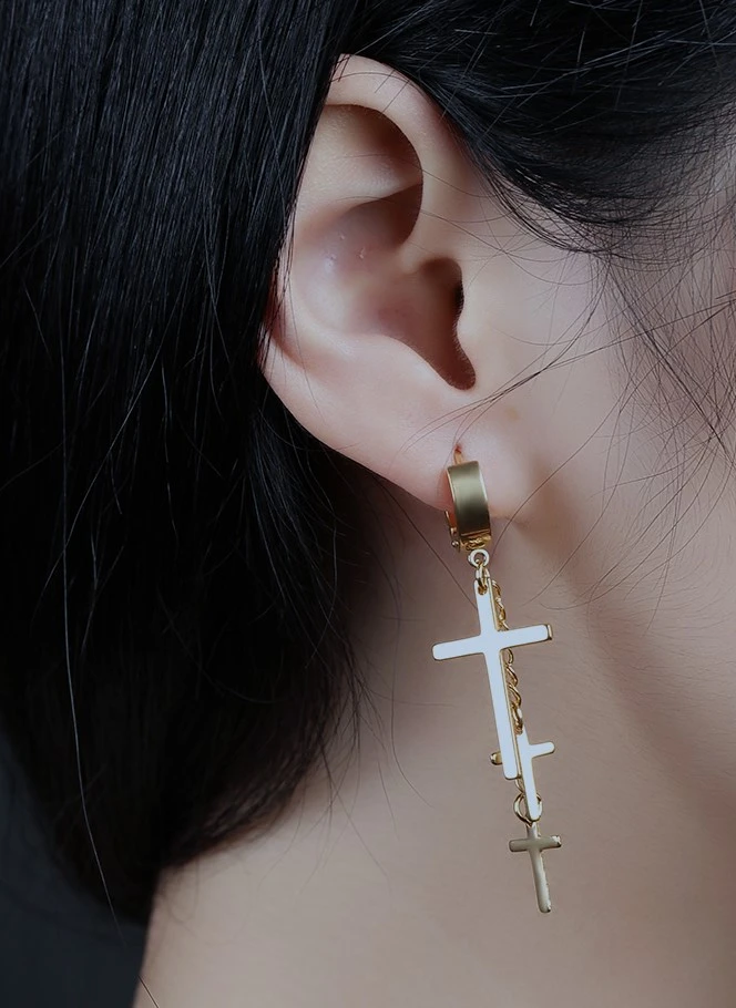 Náušnice z chirurgické oceli kroužky s přívěskem křížku. Kroužky mají vnější průměr 13mm, celková délka kroužku a křížků 50mm. Šířka většího křížku 16mm, šířka menšího křížku 9mm.