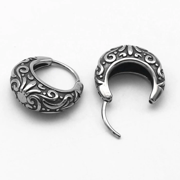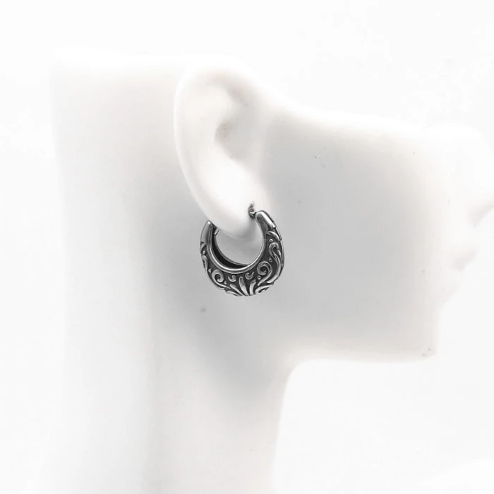 Ocelové náušnice kroužky. Povrch náušnic je zdobený plastickým vzorem. Průměr náušnic 16mm. Uvedená cena platí za pár náušnic.