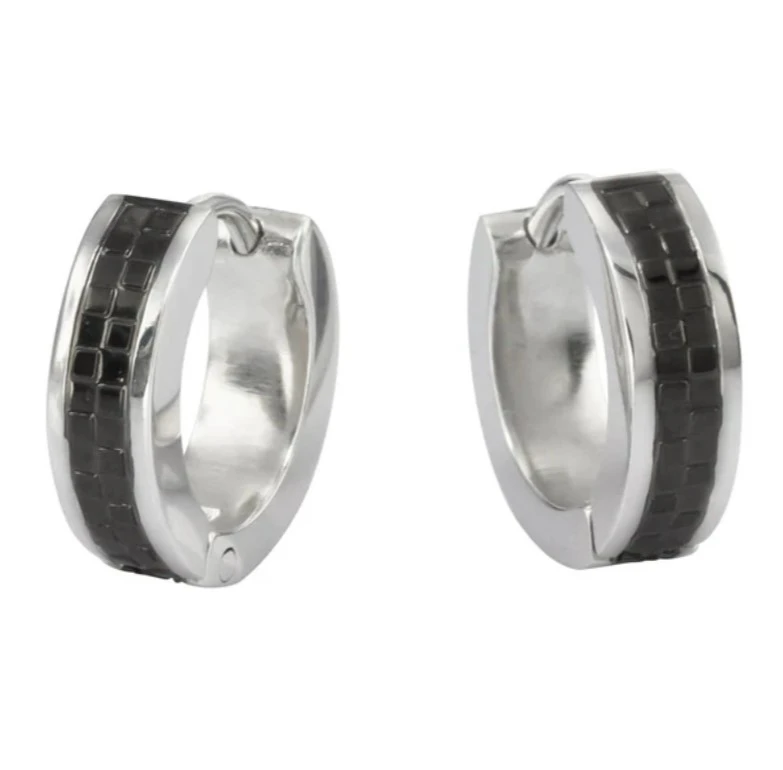 Náušnice z chirurgické oceli kroužky. Povrch náušnic je leštěný s černým proužkem uprostřed náušnic. V černé proužku je motiv šachovnice. Vnější průměr náušnic 13mm, šířka 4mm.