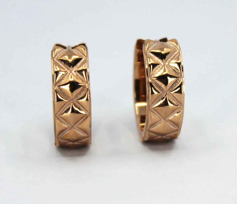Ocelové náušnice kroužky. Povrch náušnic je leštěný pozlacený technologií IP. Náušnice jsou široké 6mm, vnitřní průměr náušnic 14mm, vnější průměr 18mm. Náušnicové zapínání je kloubové. Uvedená cena platí za pár.