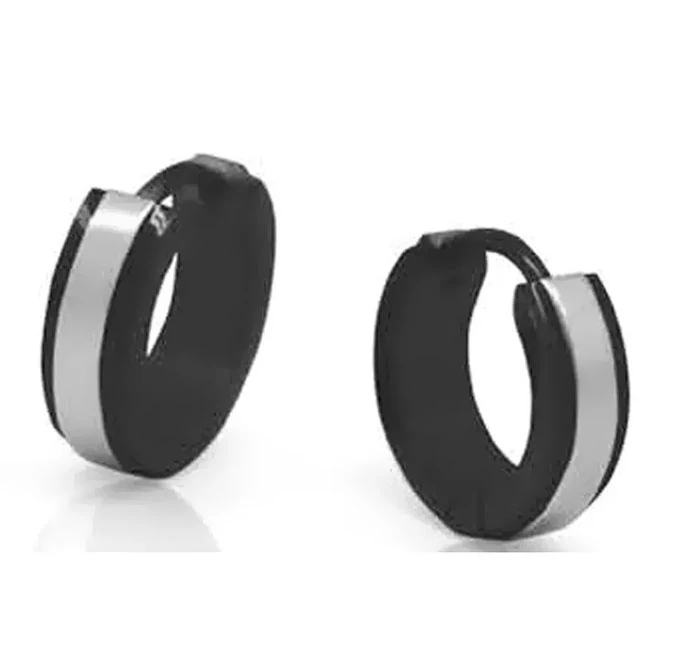 Náušnice z chirurgické oceli kroužky. Povrch náušnic je leštěný s černým proužkem uprostřed. Náušnice jsou široké 4mm, vnější průměr náušnic 13mm. Náušnicové zapínání je na kloub.