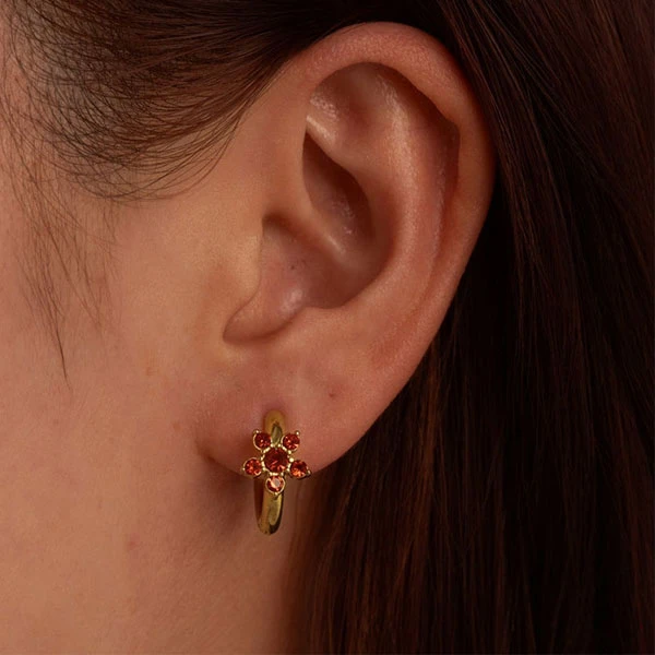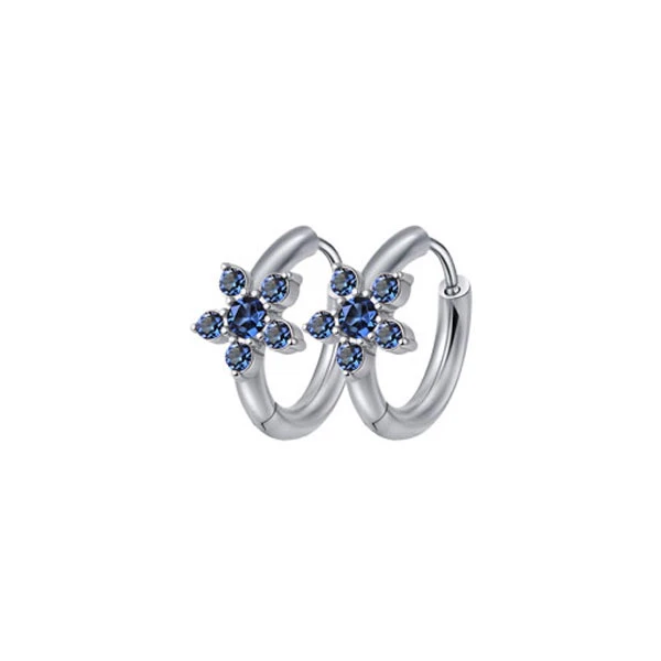 Kruhové náušnice vyrobené z chirurgické oceli. Náušnice jsou ozdobené květem se zirkony. Vnitřní průměr náušnic 11mm, vnější průměr 16mm. Ozdoba květu má průměr 8mm. Náušnicové zapínání je kloubové.